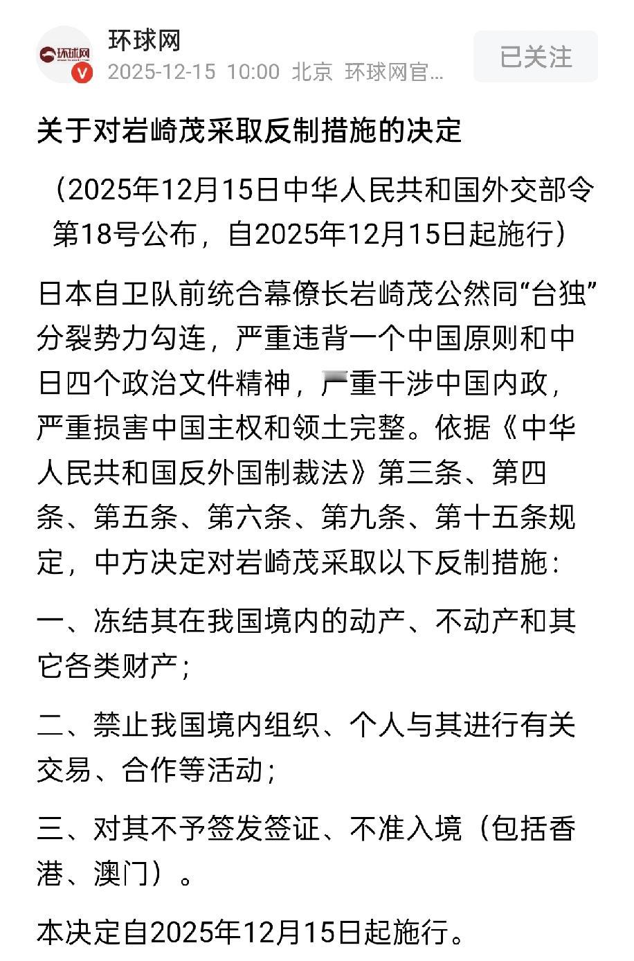 太霸气了!大快人心! 中国对日本前自卫队统合幕僚长岩崎茂采取反制措施: 1、冻结其在我国境内的动产、不动产和其它各类财产; 2、禁止我国境内组织、个人与其进行有关交易、合作等活动; 3、对其不予签发签证、不准入境(包括香港、澳门)。 岩崎茂曾担任日本自卫队的总参谋长和空军总司令,在日本政界、商界和民间都有着极高的影响力,就是这样一名享有名望的日本军人,却在今年3月接受“台独”势力的邀请,聘请为所谓“政务顾问”,任期一年。 此人严重违背了一个中国原则和中日四个政治文件,严重干涉中国内政,严重损害中国主权和领土完整。 中方在通报中用到了“三个严重”,足以见得岩崎茂的做法是多么的恶劣,让全体中国人感到愤怒。此人不仅仅是坏,用俗语说就是“坏的淌水”。我们必须反制,必须要对其制裁,这是我们的正当防卫。下发通知即日,就开始生效。 中国反制岩崎茂 中方对日反制