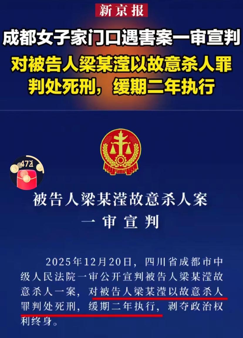 不出意外的出意外了,成都紫雅案今天14:00一审判决出炉:凶手梁珂莹死刑,缓期2年执行。 不难想象,紫雅妈妈哭晕在现场的情形,作为四川成都人,气愤的无力吐槽。上门杀人还不死刑立即执行? 死刑缓期两年,是不是2年之内不犯罪就改无期徒刑,无期立功再减刑。最后一二十年就出狱了? 凶手先是“精神病”自居,再是“带刀上门正当防卫”,求生欲望让凶手上演了一出出滑稽剧。 杀了人如此嚣张的人不多,梁珂莹算是一个。网上盛传其能量巨大,可以任意让华西医生开“精神病证明”,将案子审理进度一拖再拖。 紫雅妈妈,挺你。凶手梁应该死刑立即执行! 缓期是这意思吗?友友们怎么看这起案件? 成都女子家门口被害案择日审理 你对成都女子家门口遇害案有何感触 成都紫雅 成都女孩遇害案 成都一女子遇害 成都刺死女 成都女子被杀案 成都紫雅事件 成都紫雅案 成都女遇害案 违删!