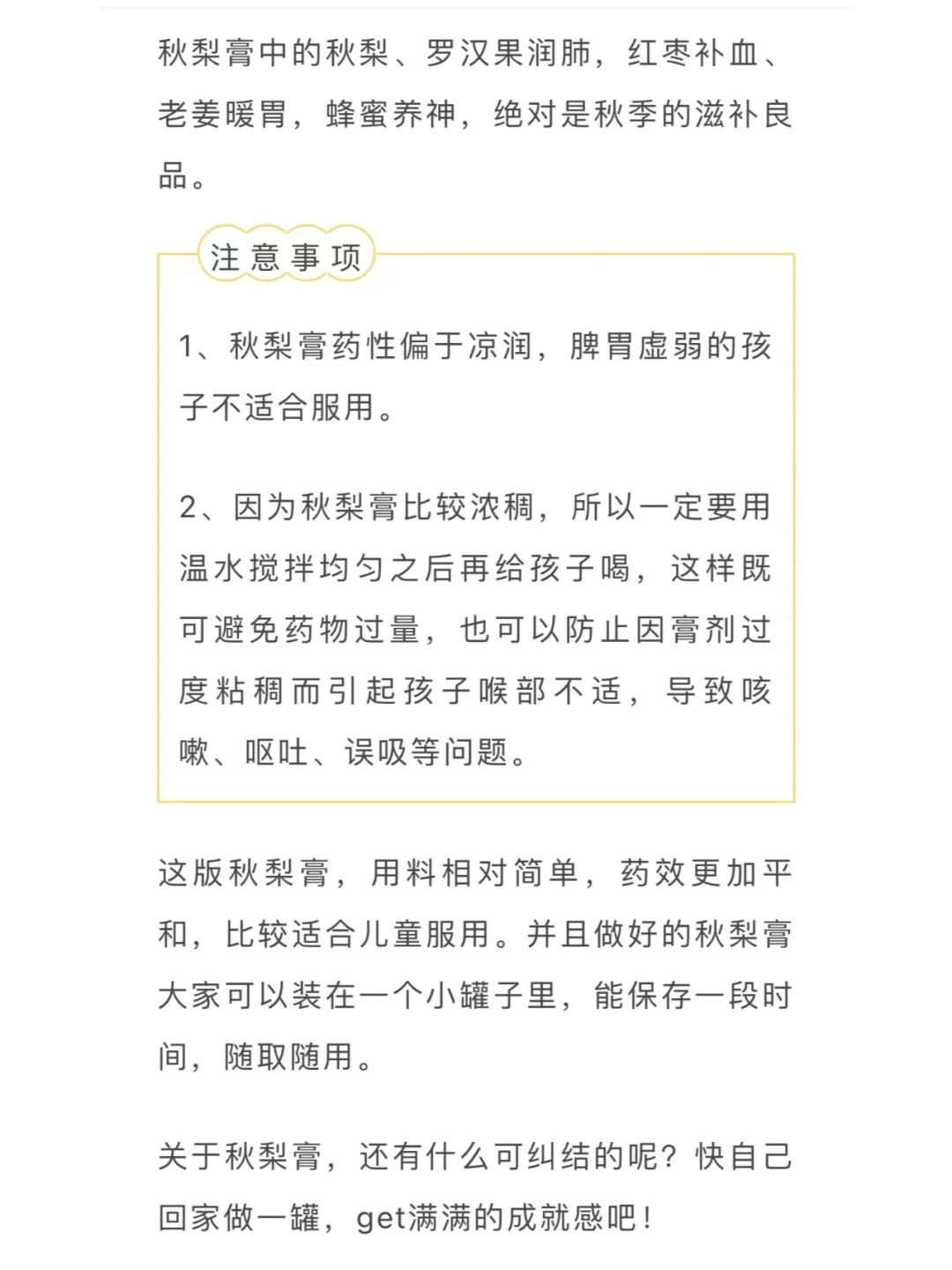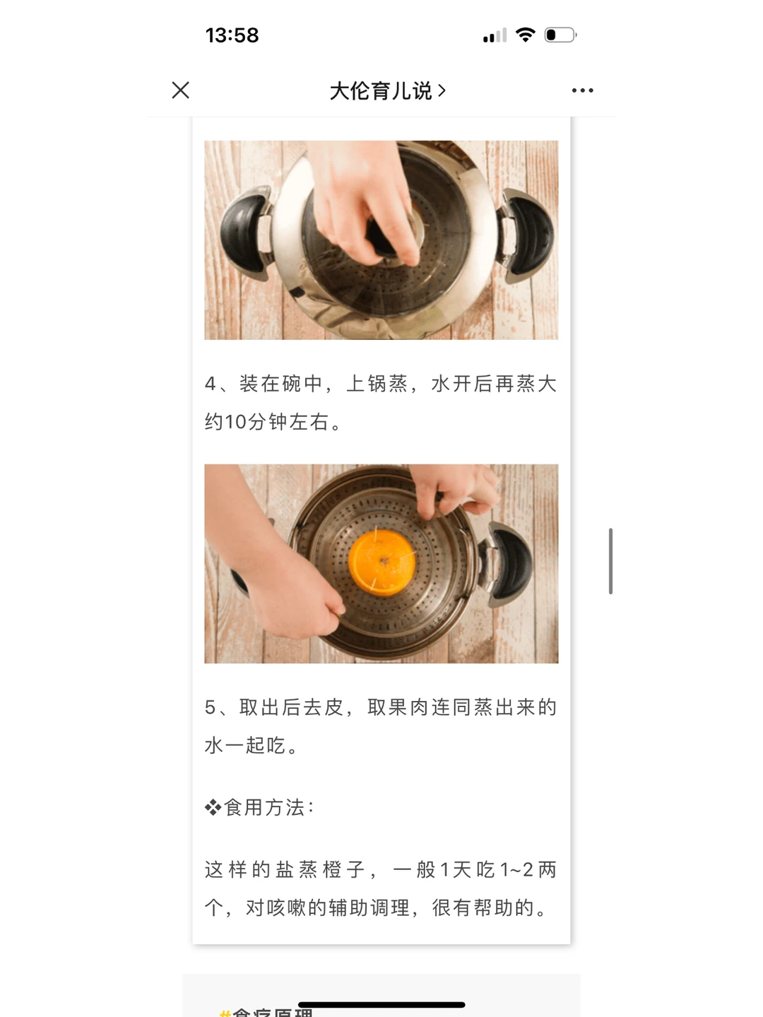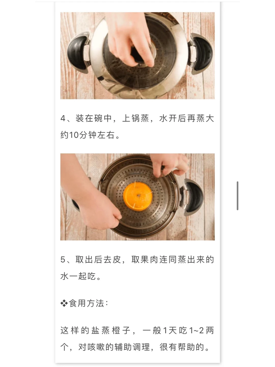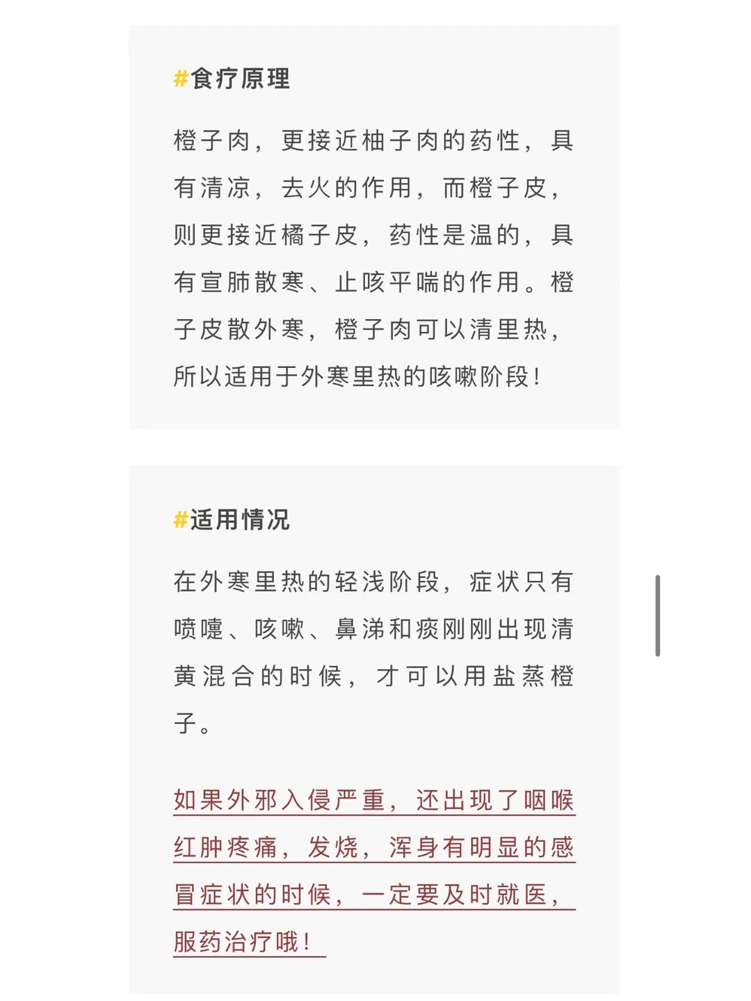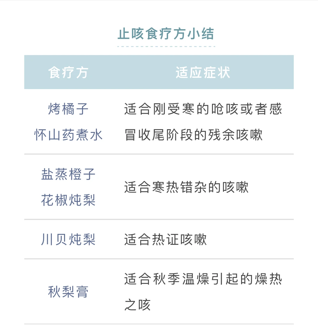 1、适合刚受寒的呛咳或者感冒收尾阶段的残余咳嗽: 💯烤橘子、怀山药煮水 2、适合寒热错杂的咳嗽: 💯盐蒸橙子、花椒炖梨 3、适合热证咳嗽 💯川贝炖梨 4、适合秋季温燥引起的燥热之咳: 💯秋梨膏(儿童定制版) 图中有详细做法。【食疗止咳方下】