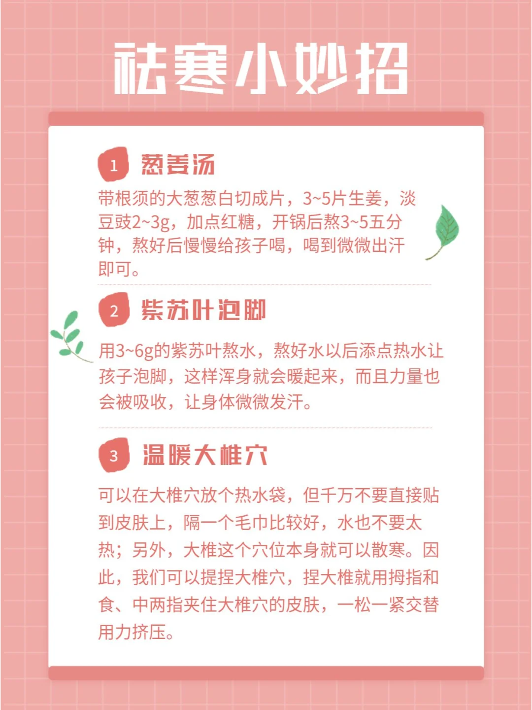这几个祛寒邪的方法建议家长等孩子受寒的时候或者睡觉之前用,这样能够把寒邪祛除得干净一些,孩子体内的阳气也不至于太辛苦,早上孩子阳气充足,就不会总是打喷嚏、流鼻涕了。当然,早晨起来也可以用,但要注意,这几个方法不要一直用,情况缓解之后,就可以停止了。