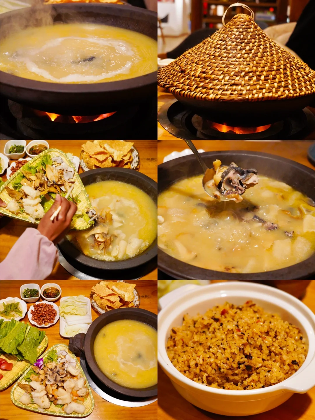 锅底是浓郁的土鸡汤,倒入许多稀有品种的野生菌,再用草编锅盖给盖上,安静等待20分钟后就可以吃了,这些叫不出名字的菌菇好滑口鲜甜,边吃边感叹:”世界上怎么会有菌菇那么好吃的食物!“还有这里的菌菇饭也是顶呱呱!