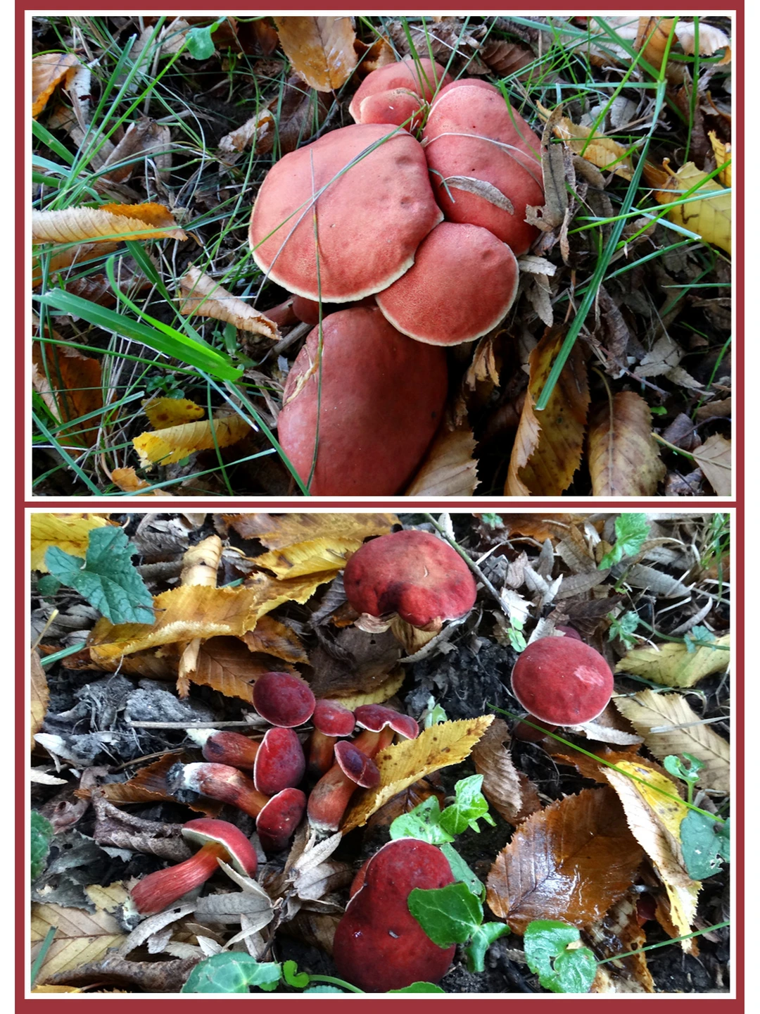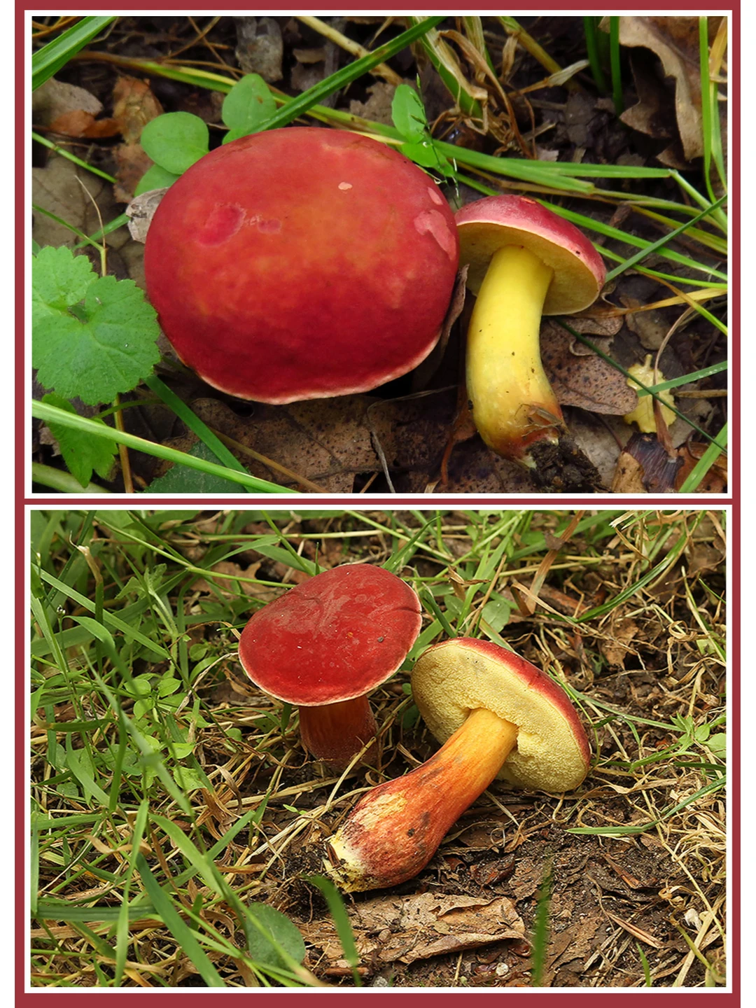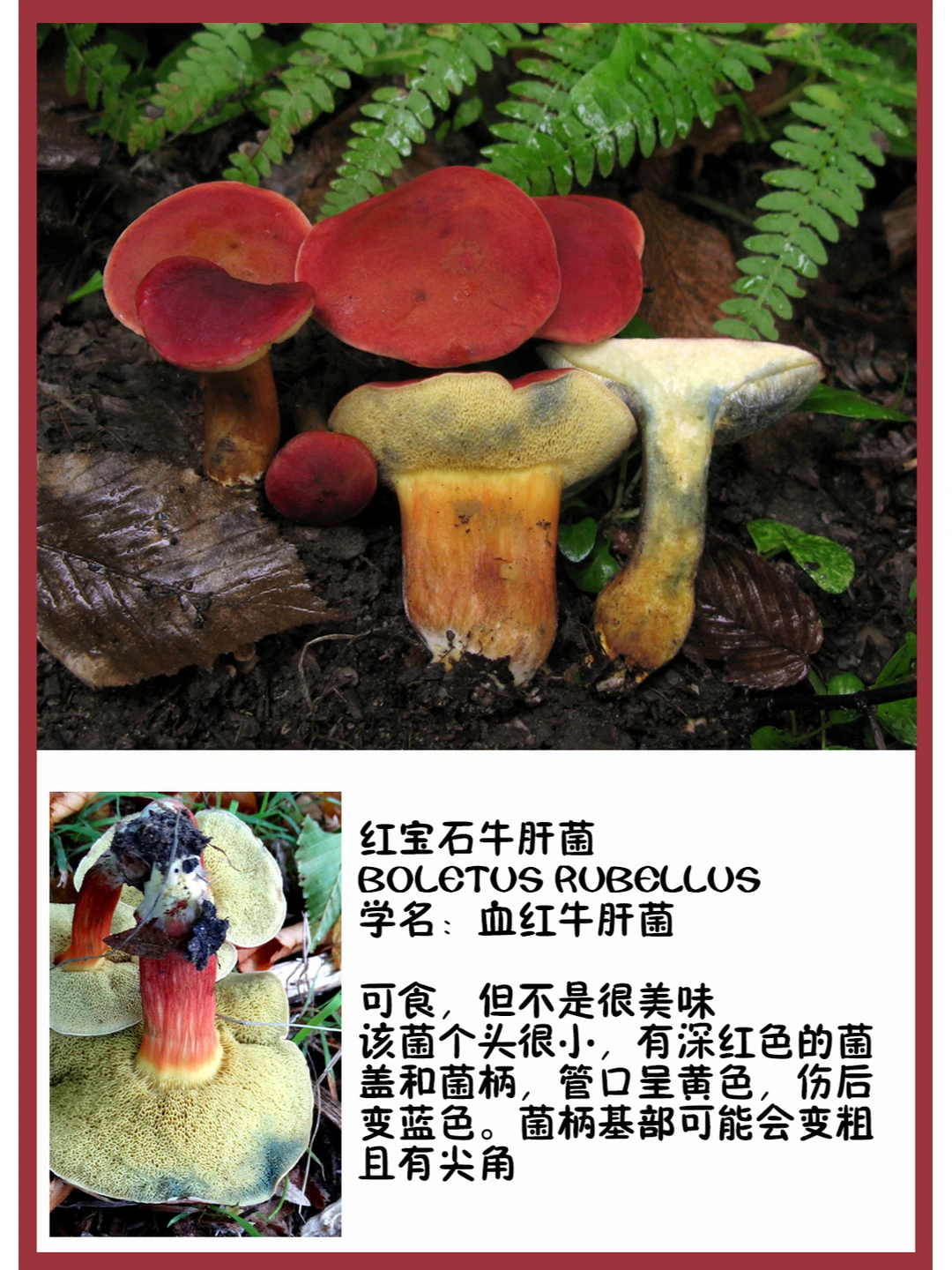 红宝石牛肝菌 Boletus rubellus 学名:血红牛肝菌 可食,但不是很美味 该菌个头很小,有深红色的菌盖和菌柄,管口呈黄色,伤后变蓝色。菌柄基部可能会变粗且有尖角
