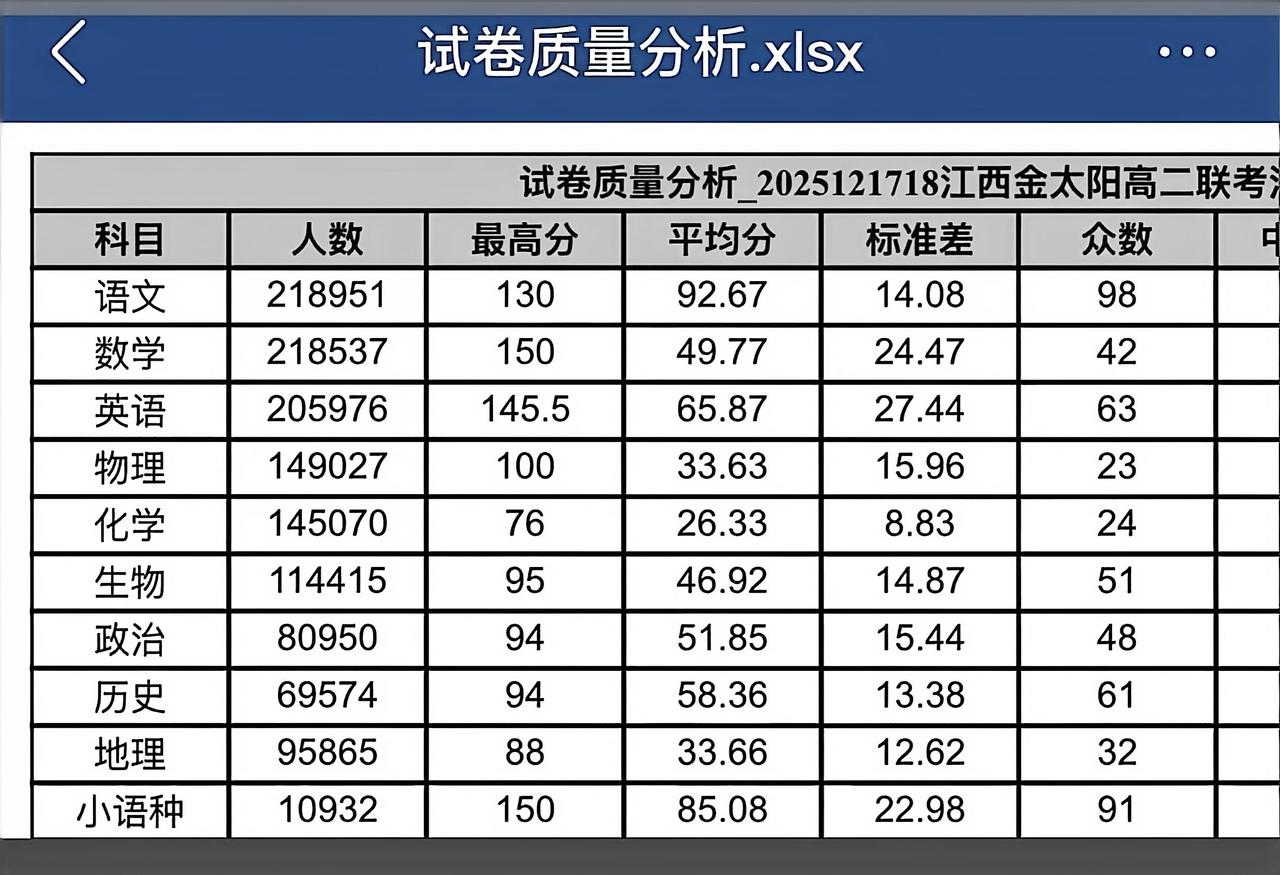 江西的化学是真难呀!物理、数学,难,但是还有天才考满分。 数学平均分只有49.77分,但有人150分。 物理平均分只有33.63分,也有同学考100分。 化学平均分只有26.33分,最高分只有76分。 所以,江西的最难科目是化学,还好有赋分,不然江西的本科分至少得再减40分。
