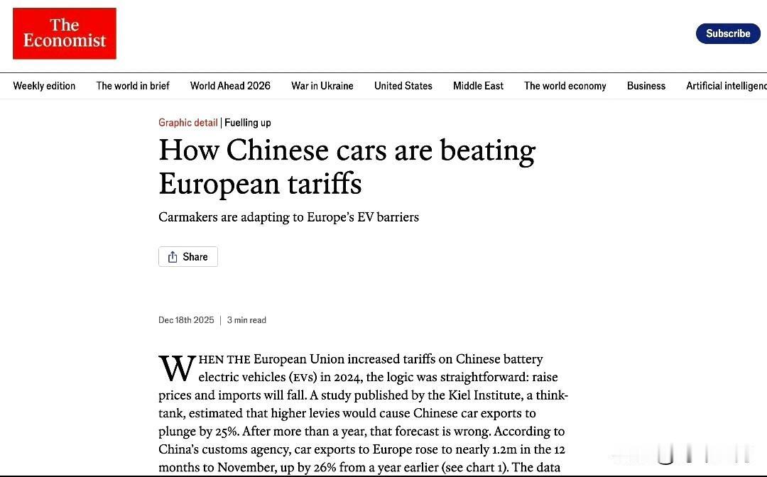 中国汽车是如何突破欧洲关税壁垒并占领欧洲。 2024年当欧盟提高对中国电池电动汽车的关税时,其逻辑非常直接:提高价格,进口就会下降。基尔研究所发表的一项研究估计,更高的税收会导致中国汽车出口骤降25%。一年多后,这一预测被证明是错误的。根据中国海关总署的数据,在截至11月的12个月里,出口到欧洲的汽车数量上升至近120万辆,同比增长26% 。数据表明,欧洲未能遏制中国制造汽车的崛起,与其说是关税力度不够,不如说是中国车企拥有规避关税的天赋。 欧洲的电动汽车关税旨在解决欧盟委员会所称的中国生产商接受国家“不公平补贴”的问题,并恢复“公平竞争环境”。但欧盟并没有对所有中国汽车征收统一的关税,而是选择了量身定制的方法。根据每家车企受政府支持的估计程度,额外关税仅适用于纯电池驱动的车辆。在该贸易集团现有10%的进口税基础上,比亚迪(中国最大的电动汽车生产商)面临额外17%的关税,吉利旗下品牌为18.8%,上汽集团为35.3%。其他中国车企则被征收20.7%的关税。混合动力汽车则得以幸免。 中国汽车制造商并没有退缩,而是改变了赛道,从电动汽车转向混合动力汽车,后者结合了电动机和汽油发动机。这种转变在数据中显而易见。尽管过去一年中国对欧洲的电动汽车月销量增长了12%,但混合动力汽车的出口量却激增了155%,尽管这是在基数较低的情况下实现的。德国汽车研究中心的贝娅特丽克丝·凯姆最近告诉德国报纸《商报》:“中国制造商改变策略只是时间问题。”混合动力汽车目前是中国汽车出口增长最快的领域,已经超过了纯电动车型。 这种效应在欧洲的展厅中已经显现。根据数据提供商Dataforce的数据,10月份中国品牌占欧洲大陆混合动力汽车销量的13%,高于一年前的仅3%。在此期间,它们在电动汽车市场的份额从8%跃升至12%。在全球范围内,混合动力汽车目前占中国客运车辆出口的三分之一。按照目前的趋势,它们将超过电动汽车和汽油车。 事实证明,中国汽车制造商非常擅长应对障碍。