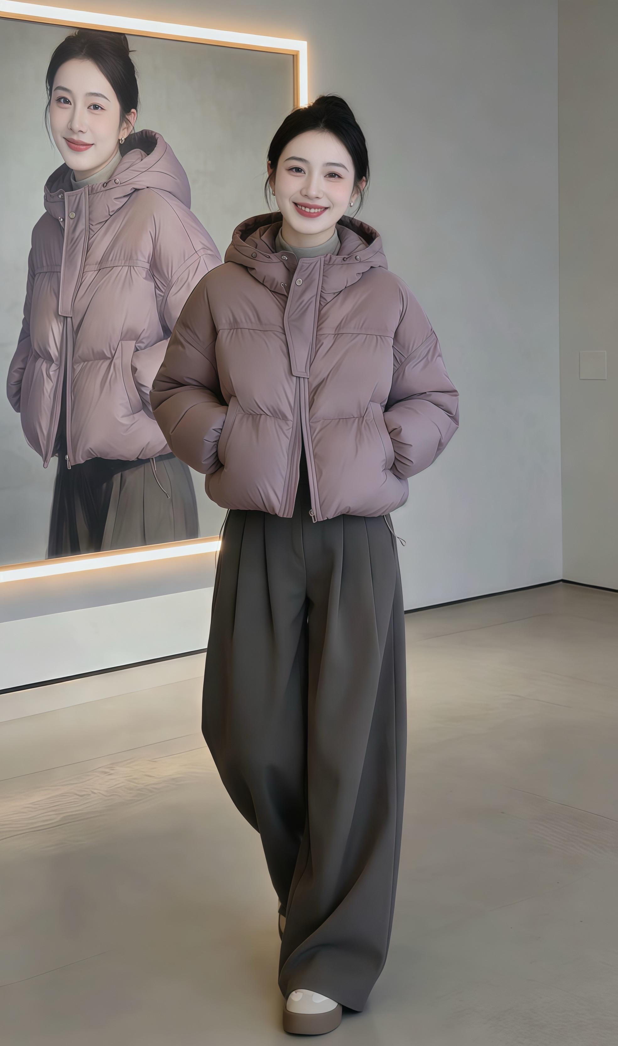 冬日甜系精致感拉满的短款羽绒服,针织大翻领温柔又软糯,低饱和浅灰调衬得...