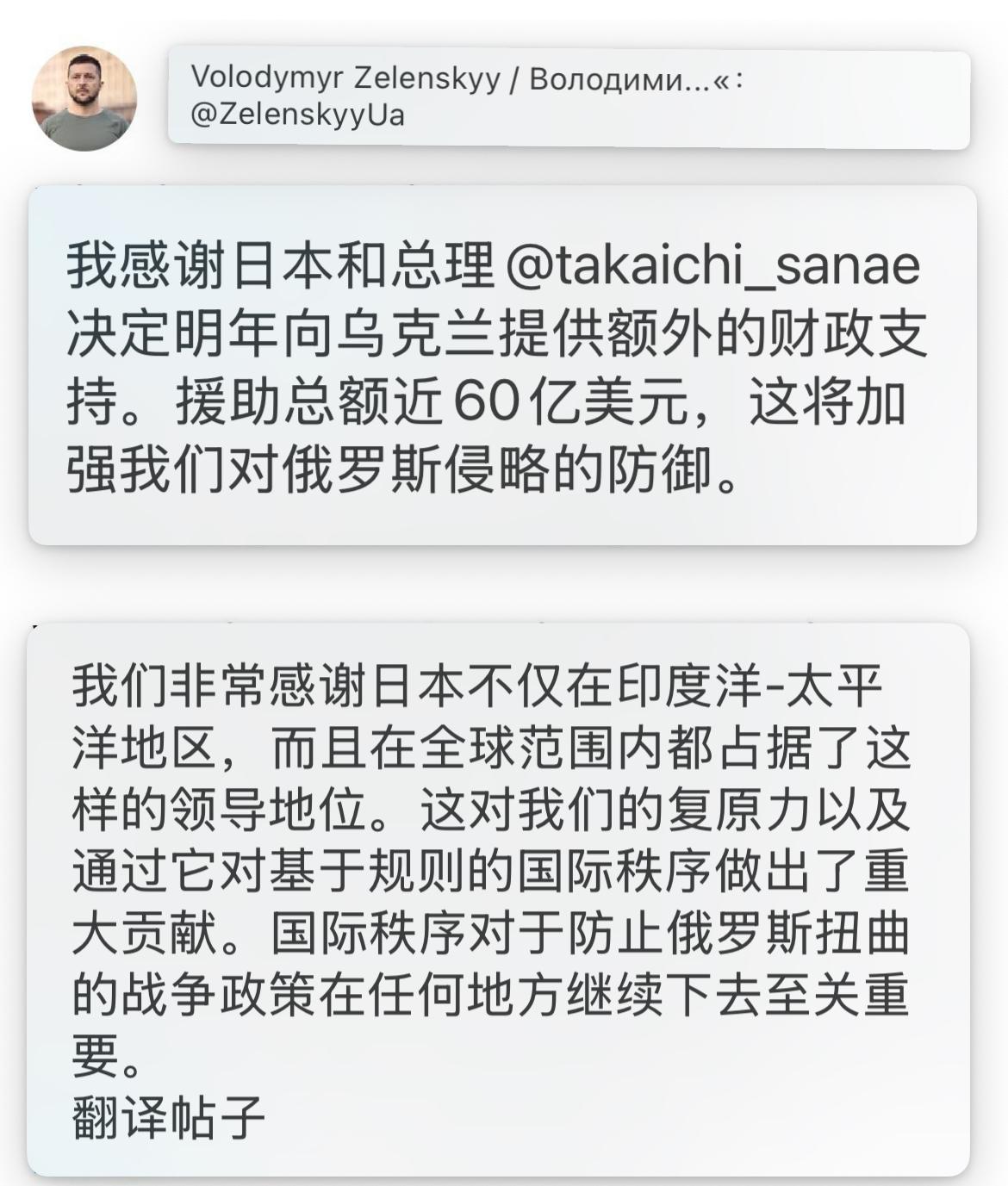 日本慷慨援助乌克兰,泽连斯基发文致谢! 乌克兰总统泽连斯基今日称:“我感激日本及首相高市早苗决定明年向乌克兰提供额外财政支持。援助总额近60亿美元,这将增强我们抵御俄罗斯‘侵略’的防御能力。我们高度认可日本展现的领导力,其不仅在印太地区,在全球范围亦是如此。这对我国的韧性贡献重大,也借此维护了以规则为基础的国际秩序。国际秩序至关重要,能阻止俄罗斯扭曲的战争政策在世界任何地方持续蔓延。” 日本此次大力援助乌克兰,意在国际舞台彰显所谓“领导力”,提升其在西方阵营,尤其是印太地区的地位,强化其在地区事务中的影响力。 显然,日本此举无疑是给俄乌冲突火上浇油。俄罗斯一直视日本在俄乌冲突中的立场为挑衅,此次巨额援助将进一步加剧俄日之间的紧张关系。 在美国停止援乌并积极斡旋俄乌冲突停火的关键节点,日本的援助看似在国际舞台博得了“存在感”,实则给自己招来诸多麻烦。其提升国际地位的如意算盘,最终也会落空。