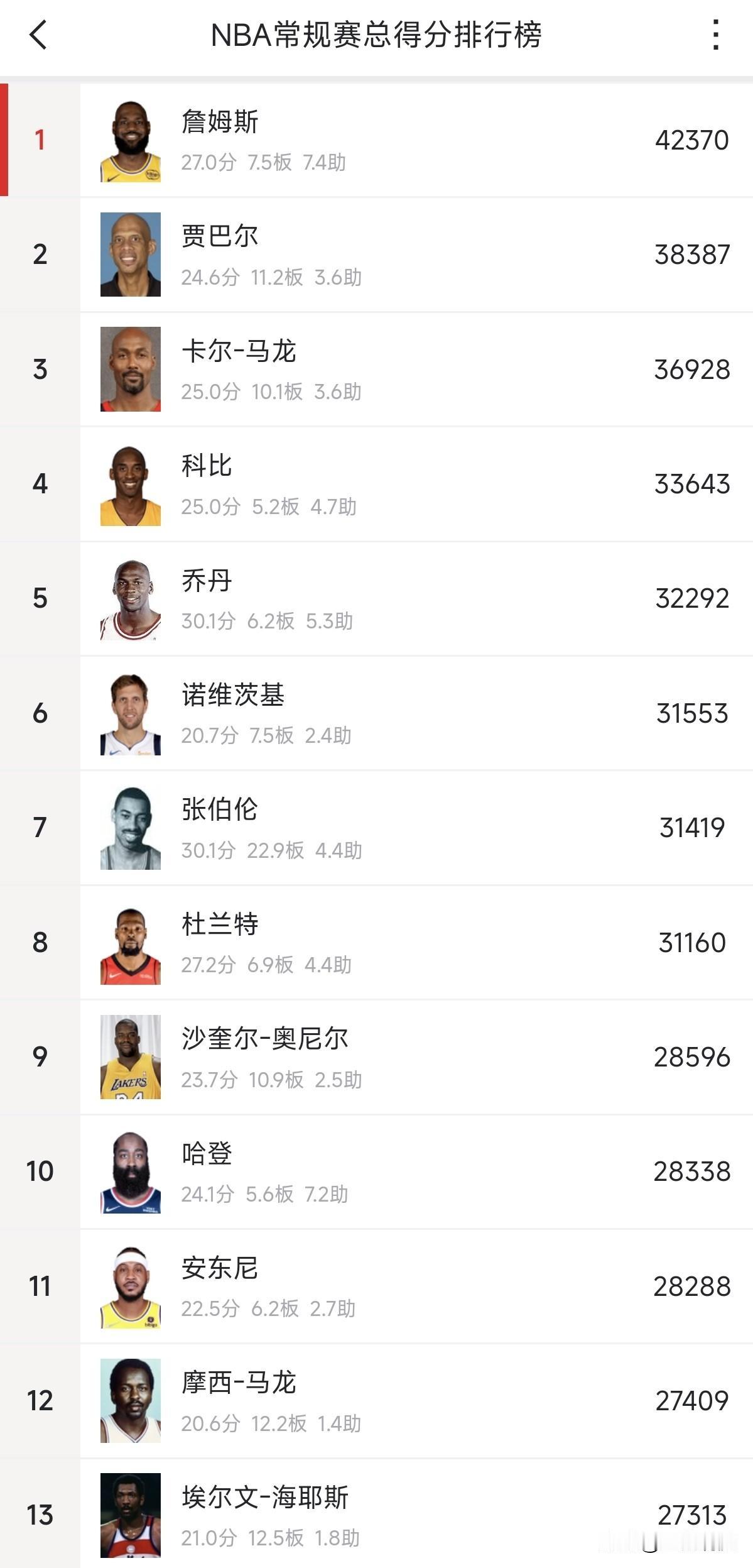 未来十年总得分超过三万分的至少有20人,长期有很多网友拿历史数据来说事,总有人觉得这个33岁状态要下滑,那个总得分提升不了多少的言论。 NBA历史上目前只有8人总得分超过三万分这是事实,但以前无论是医疗条件还是进攻效率都远远不如现在。就是二十年前的姚麦时期,一个赛季单场得分过百很少,但姚明麦迪两人得分超过球队一半,换算成现在一场120分是什么概念呢? 现在球员特别是头号球星都注重进攻,可以说几乎不防守,同时三分球比例大幅度提升。所以未来一个赛季得分超过2000分可以成为常态现象。 目前来看球员总得分超过40000分甚至超过詹姆斯确实有很大难度,但是三万分对于一部分球星来说还是比较容易的,可以肯定的说,十年之后,超过三万分的球星至少达到20人以上。