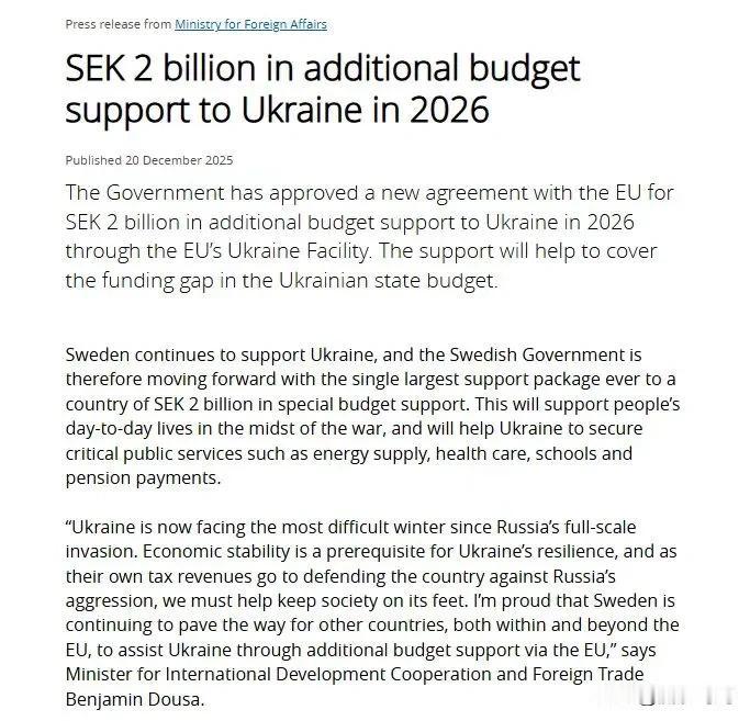 瑞典已批准与欧盟达成一项新协议,将通过欧盟的乌克兰援助机制,在2026年向乌克兰提供额外的1.7亿欧元预算支持。这项援助旨在帮助乌克兰弥补预算缺口,并在战时维持能源、医疗、教育和养老金等重要的公共服务。欧洲对乌援助