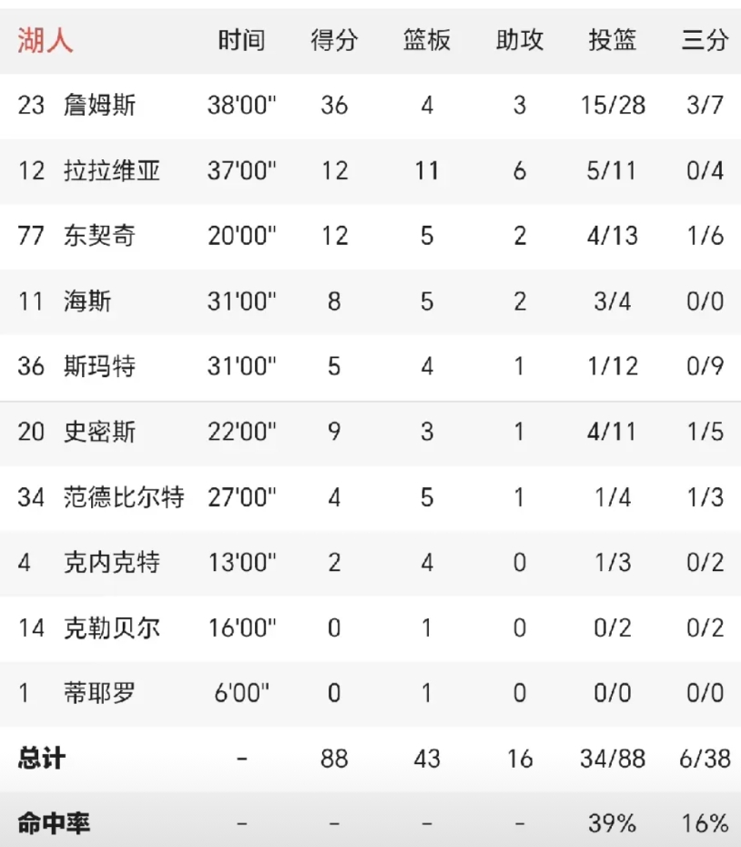 早就说过,雷迪克如此使用东契奇,早晚把他累坏。 这不,常规赛才打了27场,东契奇就又伤了,里夫斯小腿拉伤还没复查确诊呢! 在今天客场挑战同城对手快船的比赛中,东契奇伤退后没再上场,他只出场20分钟,13中4仅得12分。 原来此前命中率低,都是太累了吧! 詹姆斯28中15,豪取全场最高的36分,只是队友发挥拉胯,球队惨败。 看看湖人三分命中率: 拉拉维亚4中0; 斯玛特9中0; 东契奇6中1; 史密斯5中1; 克内克特、克勒贝尔都是2中0。 全队38投只命中6个三分,命中率16%,快船投中了16个! 这场比赛,克内克特也上场了13分钟,再没了神奇小子的灵动,只得2分;克勒贝尔更惨淡,出场16分钟,只收获1个篮板。 这样的状态,输球也是顺理成章了!
