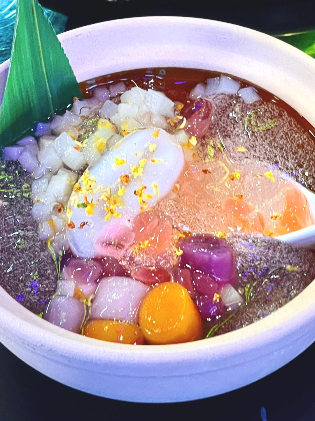🍮甜品:这两款甜品超好吃的!砂煲冰粉是那种晶莹剔透的冰粉,有芋圓、海底椰、桃丁、寒天和桂花,一口一个大满足呢!还有竹筒奶凍,0卡糖没负担,奶冻上还有椰蓉和椰片,甜而不腻还滑口!