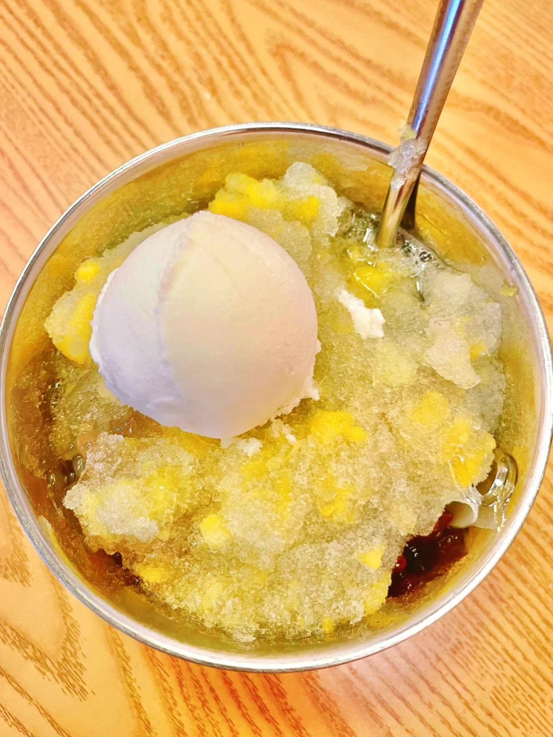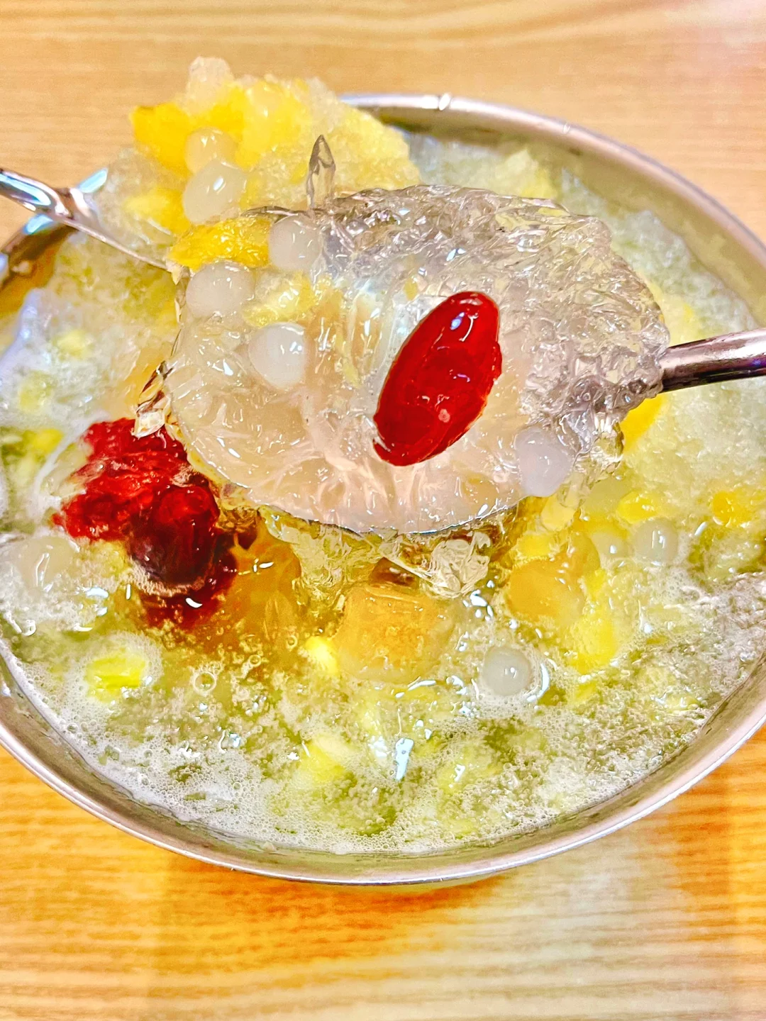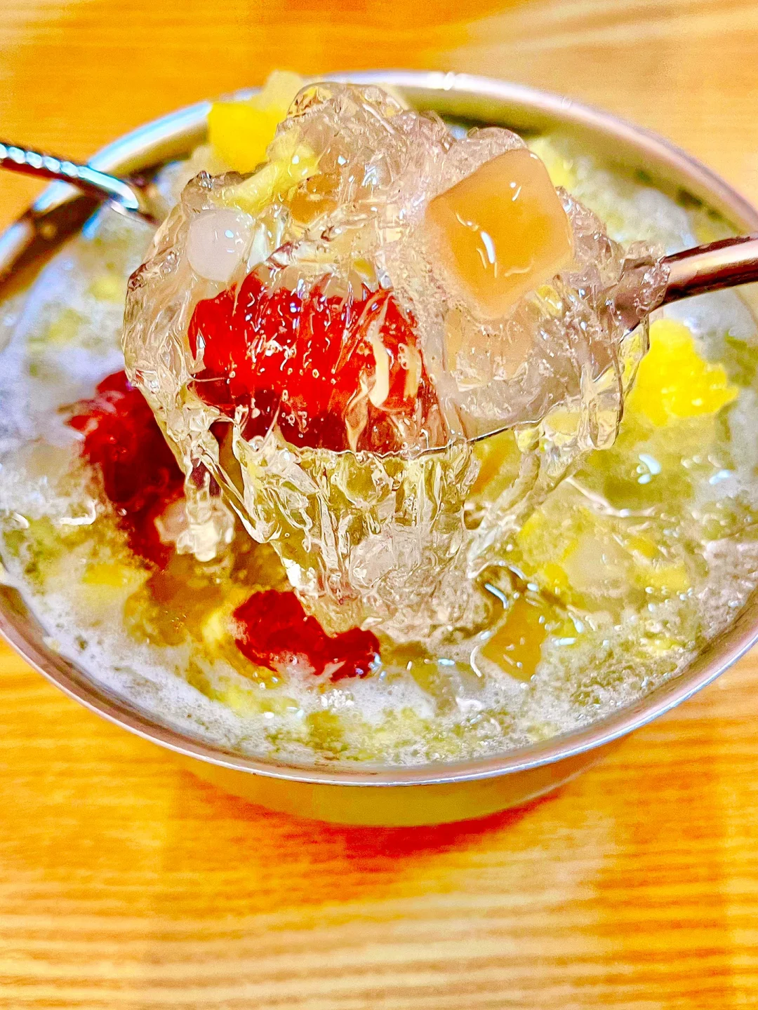 😂这家店有点高冷,没有点单工作人员,只有自助下单,我点了招牌菠萝冰海花,这个有新鲜的菠萝果肉和像粉丝条一样的海石花,吸一口碎冰冰凉凉超清爽,好像小时候吃的菠萝冰味道✨我爱了‼️如果想要多点料的话,可以点菠萝冰清补凉,有红枣西米露椰果等小料,再➕个雪球真的太满足❤️对了这家店的无骨鸭掌也不错~凉拌的!超入味!酸辣可口!