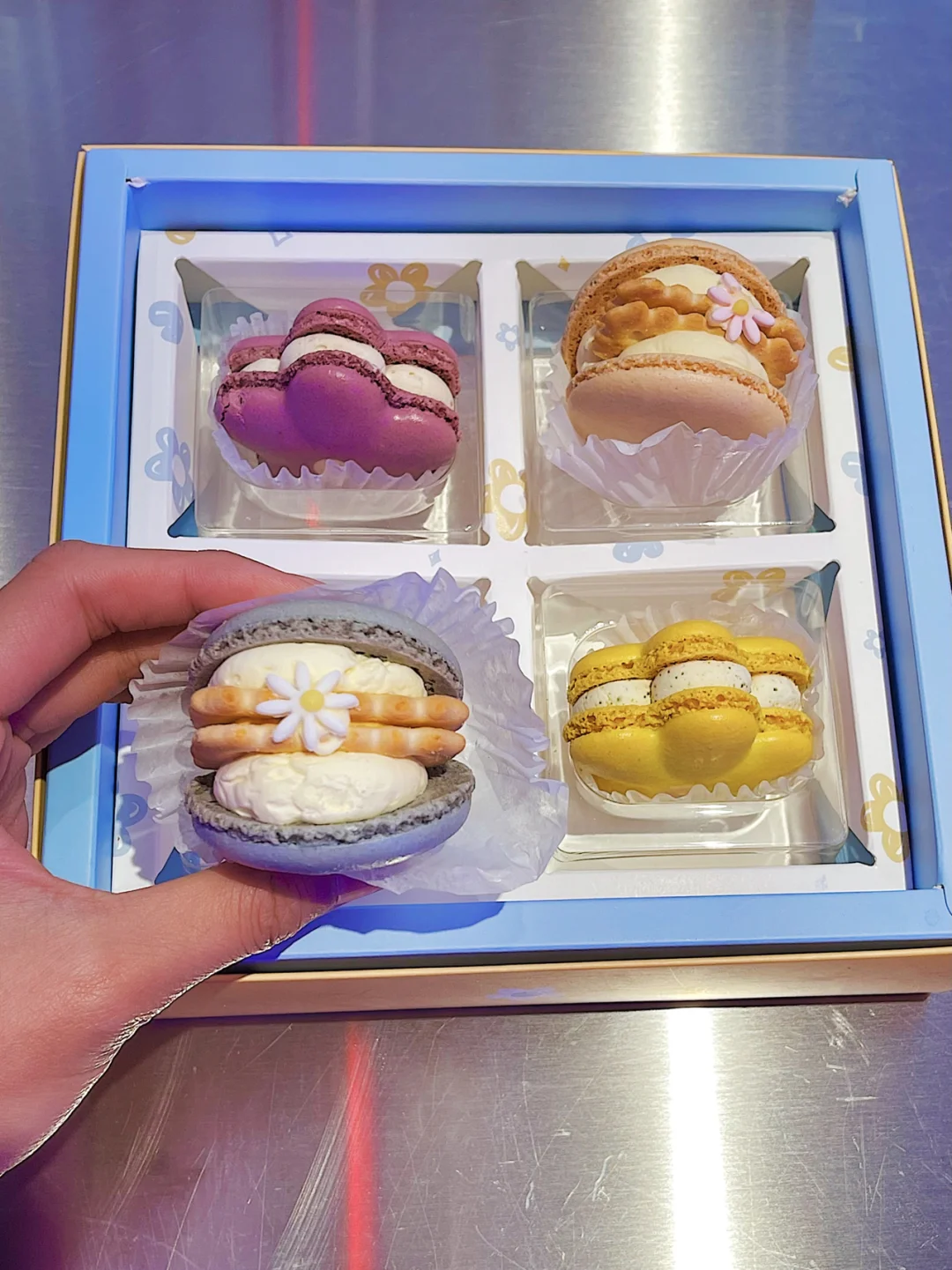 4⃣️马卡龙:🍮听说是店里推出来的新品系列,造型是花花形状颜值很高,一共有海盐芝士胖打、玫瑰蜜桃、香草苏打、茉莉威廉莉这四种味道,外皮软糯,有两块是带着夹心饼干,里面都带着铁塔的淡奶油甜而不腻,买完放进冰箱冷藏有着冰淇淋的口感,最爱咸中带甜的柠檬蜜桃,完全不输于在法国甜品店吃的马卡龙。
