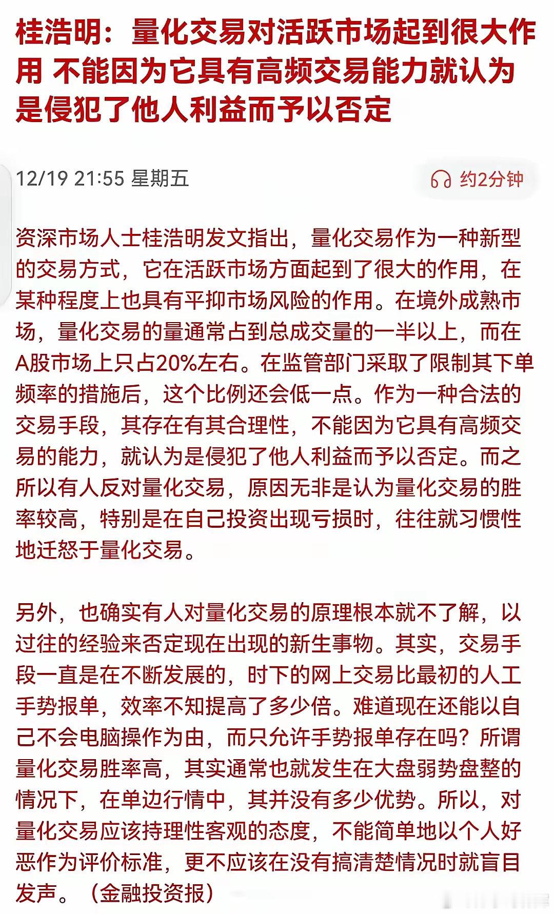 量化的存在是我们技不如人,但量化不应该把设备放到券商处,不公平;更不应该又交易所的资金流入流出数据,偷看底牌,即使你付了费,那是交易所扯淡!融券,不仅是量化,所有融券都应该禁止!大股东减持应发公告,通过融券减持谁发公告了?这就是他妈扯淡!是证监会的政策扯淡!