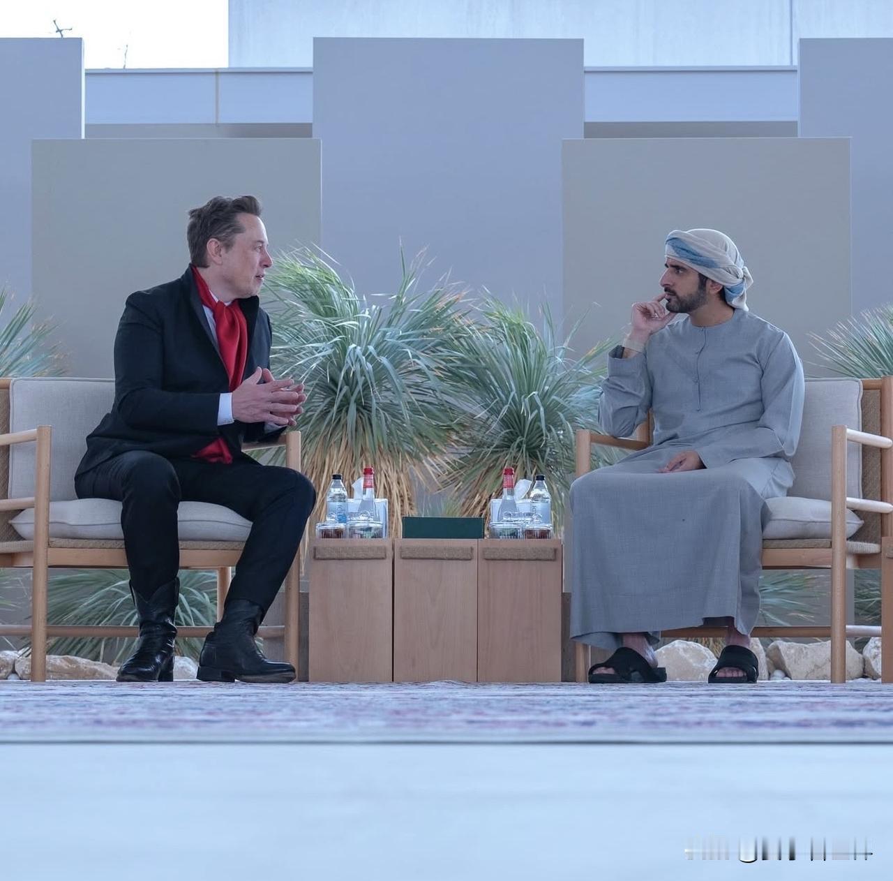 阿联酋王储哈姆丹•本•穆罕默德在迪拜会见伊隆•马斯克。马斯克穿着特制的服装,X娃随行。 | very much enjoyed a multifaceted discussion with Elon Musk on space, technology and humanity. Excited to see what the future holds.