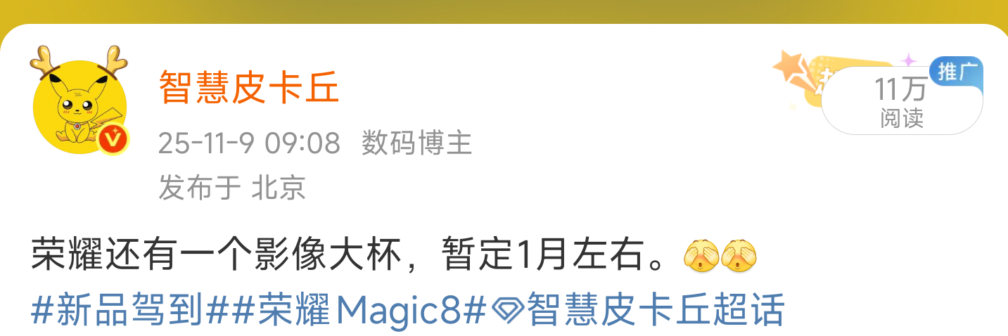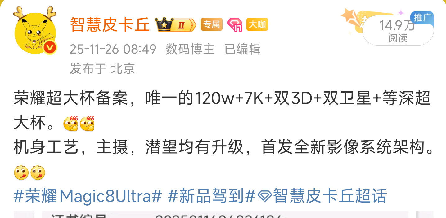 谁说春节前只有一款超大杯的。另一款除了之前说过的,屏幕,卫星通信,追焦还有新升级,16/24,512/1T。最大的看点还是首发全新的影像系统架构。新品驾到荣耀Magic8RSR智慧皮卡丘