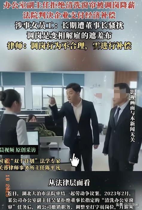 “色欲熏心?”湖北大冶,女子本是办公室副主任,董事长指定让她“清洗办公室窗帘”,女子果断拒绝,被降职到打字员,4300元月薪也降到3000元,还招新人替代女子工作,甚至换了女子办公室的门锁,这一切都是因为董事长经常给她发骚 扰信息,她多次明确拒绝,却遭董事长调岗降薪报复,女子一气之下告上法院,法院作出公正判决。 湖北大冶的冬天,总带着湿冷的味道。办公室里暖气微弱,窗外雾气笼罩着街道。吴女士早早到达公司,把手套和围巾放在椅背上,打开电脑,开始整理当天的工作。 她是公司的副主任,工作能力出色,平日里处理事务井井有条,同事们对她既敬又畏。然而,她的职位光鲜背后,却隐藏着令人窒息的压力。 董事长李某,一位年过五十的男人,平时衣着考究、言语谦和,但在私下里,他的行为让人无法忍受。 最初,他只是通过微信偶尔发一些“关心”消息,但很快,这种关心就变得带有挑逗意味。 “吴小姐,今晚加班吗?工作太累了要注意休息啊。” “董事长,我自己会注意的。”吴女士礼貌回绝,心里已经有些不快。 但是,李某并未停止,他开始在办公室单独找她谈事情时,言行愈发让她不适。他靠得太近,讲话中夹杂不必要的私密话题,每一次眼神的停留都让吴女士感到心底发冷。 她尽量用职业的态度回应,但内心的抗拒越来越强烈。 终于有一天,李某提出了一个荒唐要求:“吴小姐,帮我清洗一下办公室的窗帘吧。” 吴女士愣了一下,抬眼看着他:“这……不是清洁工的工作吧?我不负责这个。” 李某脸色微变,眉头轻蹙,语气里带着不容置疑的威压:“这是命令。” “抱歉,我拒绝。”吴女士声音坚定,她知道,一旦妥协,她将永远陷入被动。 第二天,她来到公司时,却发现自己的办公桌空荡荡的,旁边坐着一位陌生的新人,正忙着整理文件。她走到人事部,心中忐忑,却被告知:“副主任岗位已调岗,你现在是打字员。” 工资也从4300元降到了3000元,办公室的门锁换了,她再也无法进入原来的办公区域。吴女士明白,这是报复,是对她拒绝董事长要求的惩罚。 夜深人静时,吴女士独自坐在小公寓里,翻看手机里一条条骚扰信息,她的手微微发抖,心中涌起一股难以言说的愤怒与委屈。 泪水在眼眶打转,但她深吸一口气,握紧手机,做了一个决定:走法律途径。 她开始收集证据:聊天记录、同事证言、公司内部文件……每一份资料都像是一块块拼图,记录着自己被骚扰和报复的过程。 庭审那天,吴女士坐在法庭上,面容平静,但目光坚定。 面对法官,她缓缓开口:“我在公司一直尽职尽责,但董事长多次发骚扰信息,甚至在办公室单独相处时举止不当。我多次明确拒绝,但第二天就被降职调薪,更换办公室门锁……这是报复。” 公司方律师声称:“调岗降薪是公司根据工作需要安排的正常操作。” 吴女士反问:“那为何一切都发生在我拒绝董事长要求之后?公司能提供合理证据吗?” 庭审持续数次,法官仔细审阅证据,最终作出判决:确认吴女士与公司劳动关系解除,判令公司支付经济补偿47300元,加上未休年假工资,总计50463.22元。 吴女士听到判决结果时,长舒一口气。她知道,这并非完全胜利,但至少她捍卫了自己的尊严,也给公司和社会传递了一个明确的信号:职场骚扰与报复,不能被容忍。 庭外,同事们看着她,眼中充满敬佩。有人轻声说:“吴姐,你真的很勇敢。”