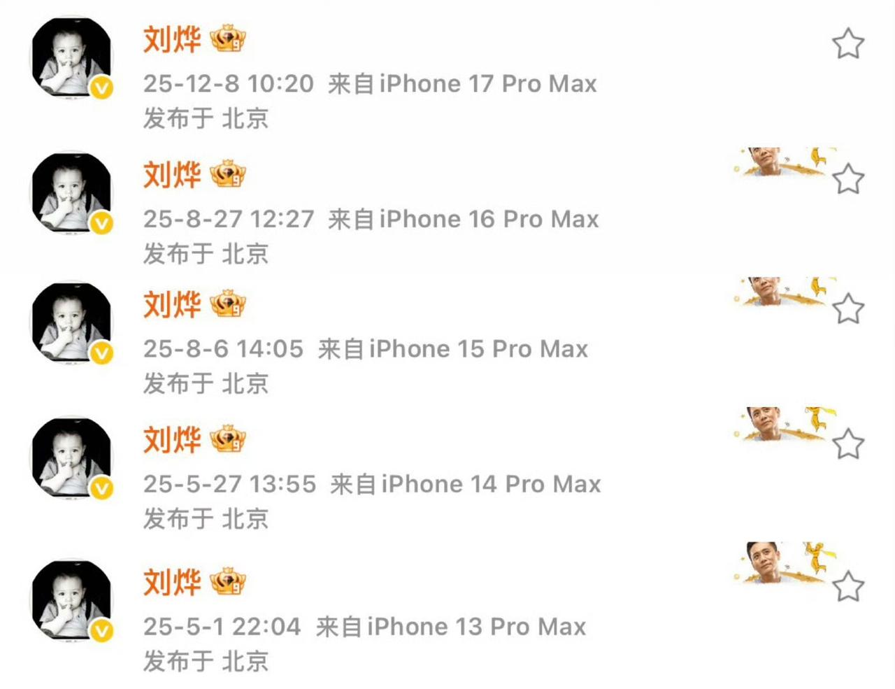 刘烨,到底谁教你这么换手机的[泪奔] 半年时间换了5次手机,还是挨着型号换 iPhone13 Pro Max iPhone14 Pro Max iPhone15 Pro Max iPhone16 Pro Max iPhone17 Pro Max