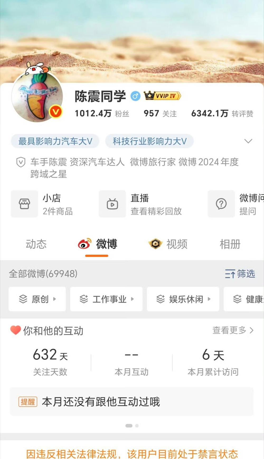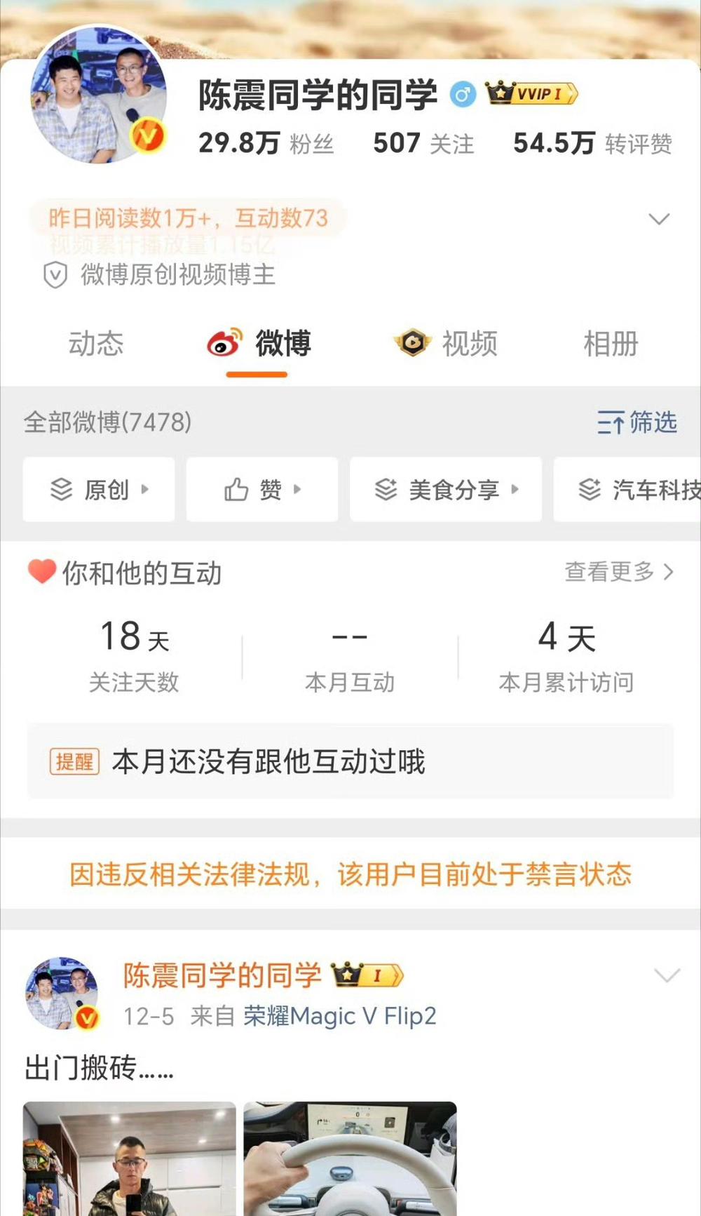 陈震的部分社交平台账号如B站、小红书短暂解封了,暂未更新内容,他的微博大号和小号目前还处于禁言状态! 大家最关心的还是他什么时候被解封能够发布第1条内容,发布的第1条内容究竟是发什么内容,还挺令人期待的。 陈震有时的内容虽然没啥营养,但是娱乐属性叠满了,他和其他的大v有非常大的不同,很多大v都是找各种各样的内容。 陈震的一个内容板块是和网络上的网友进行对话,虽然有些逻辑上对不起来,但是还是挺有意思的。 大家是怎么看的?欢迎评论区留言。