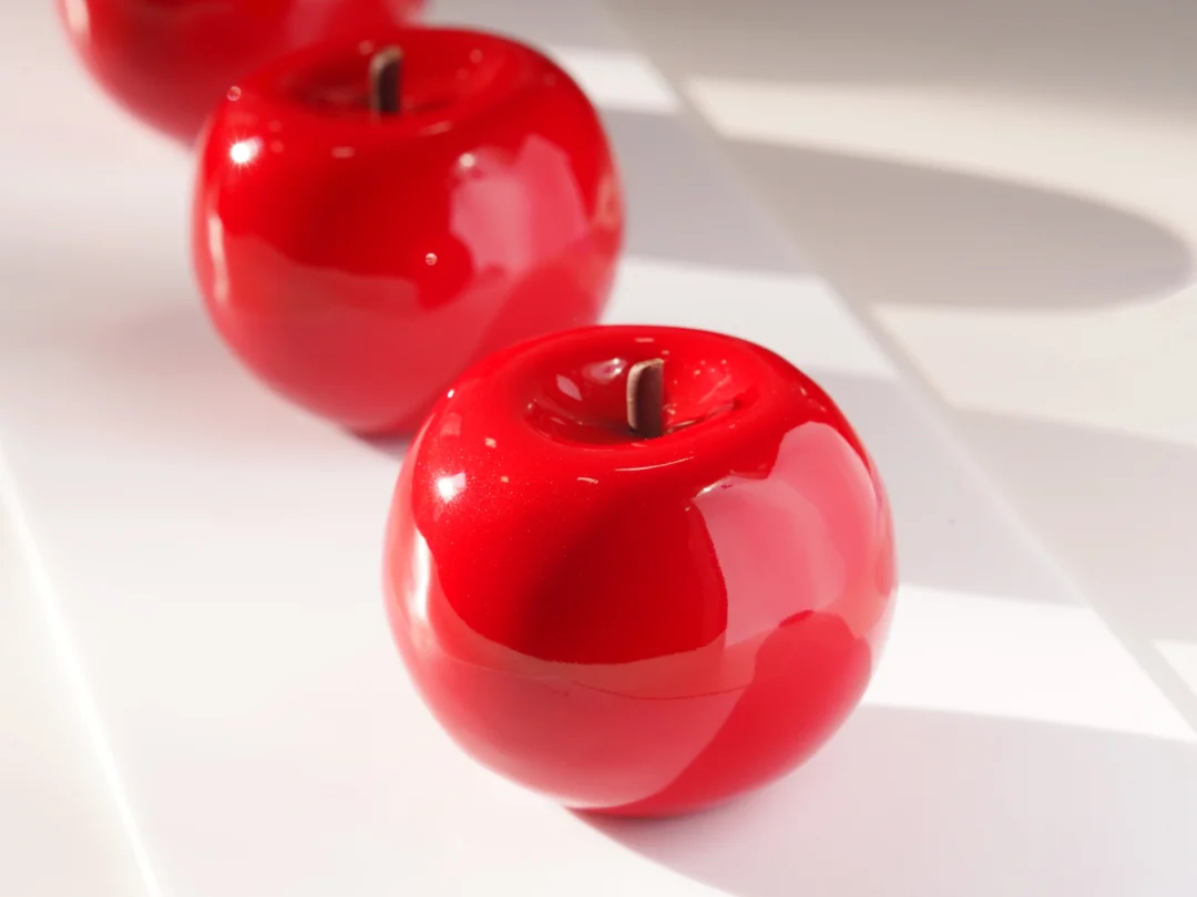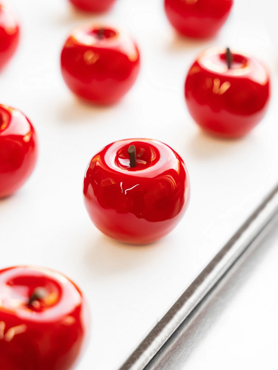 2、苹果脱模后,手里垫一张厨房纸再进行塑形操作,避免手温融化甘纳许。