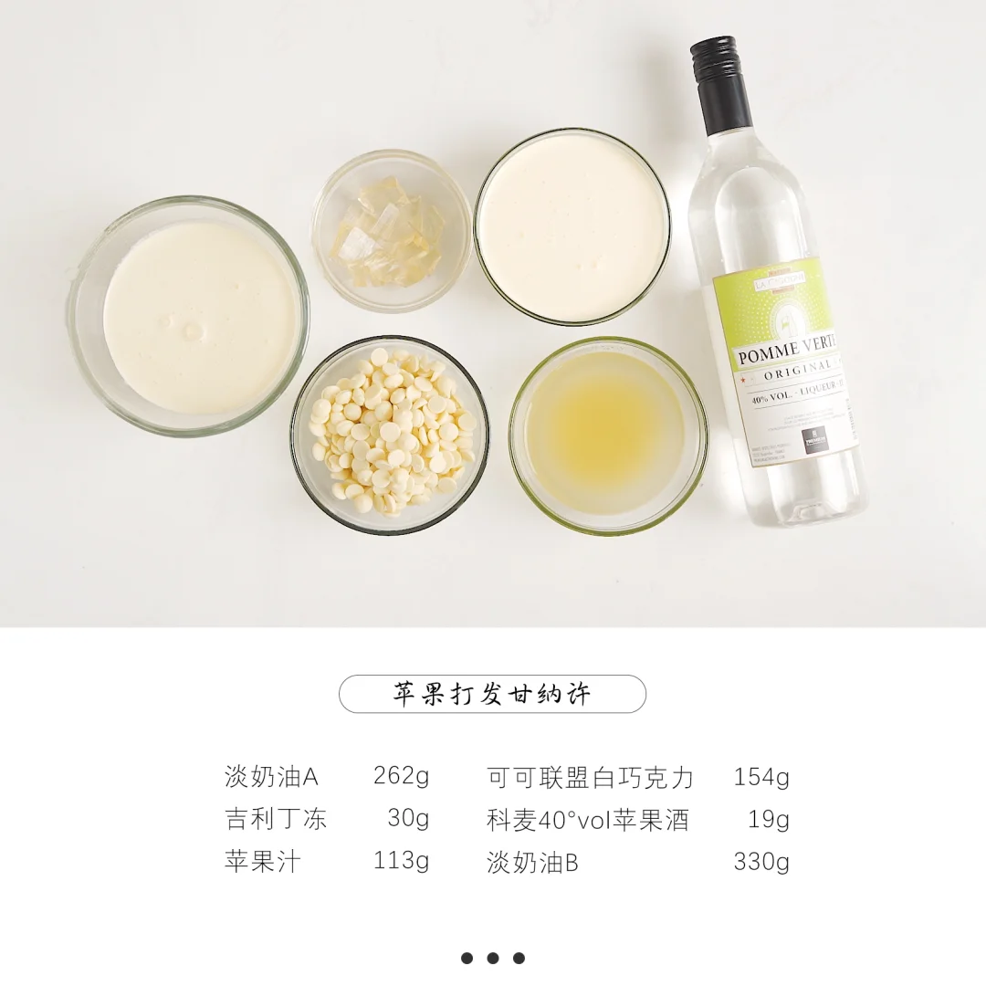 2、淡奶油加热至50°C左右离火冲入量杯中静置1-2分钟,再依次加入苹果酒、苹果汁和淡奶油B,用均质机乳化至顺滑质地。