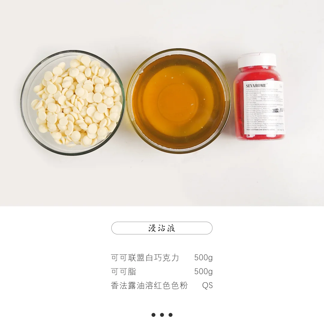 巧克力和可可脂微波融化搅拌均匀,加入适量红色色粉均质打匀。