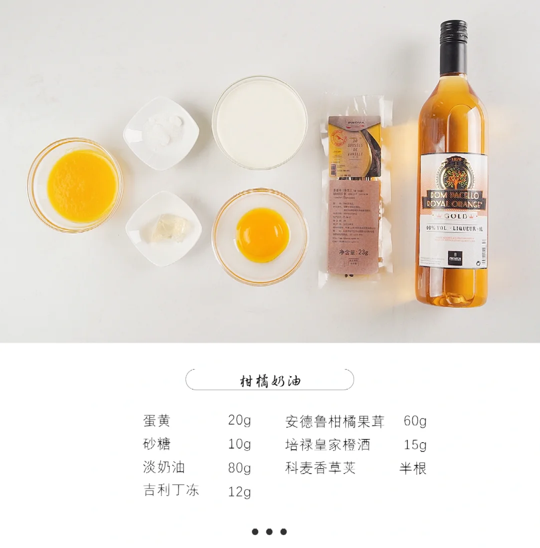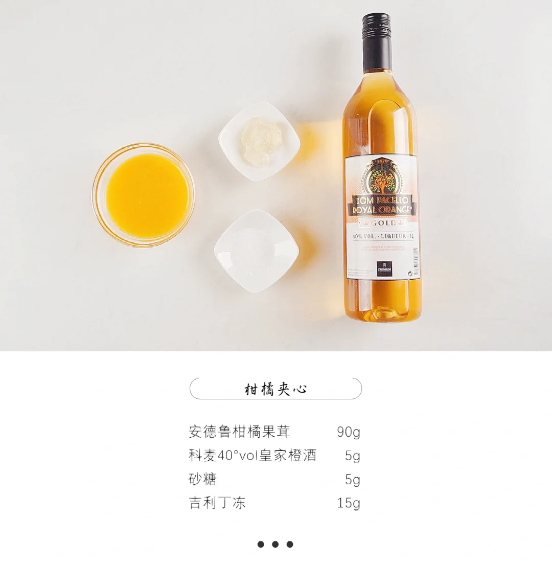 2、加入橙酒搅拌均匀,裱挤到柑橘奶油上,冷冻冻硬。