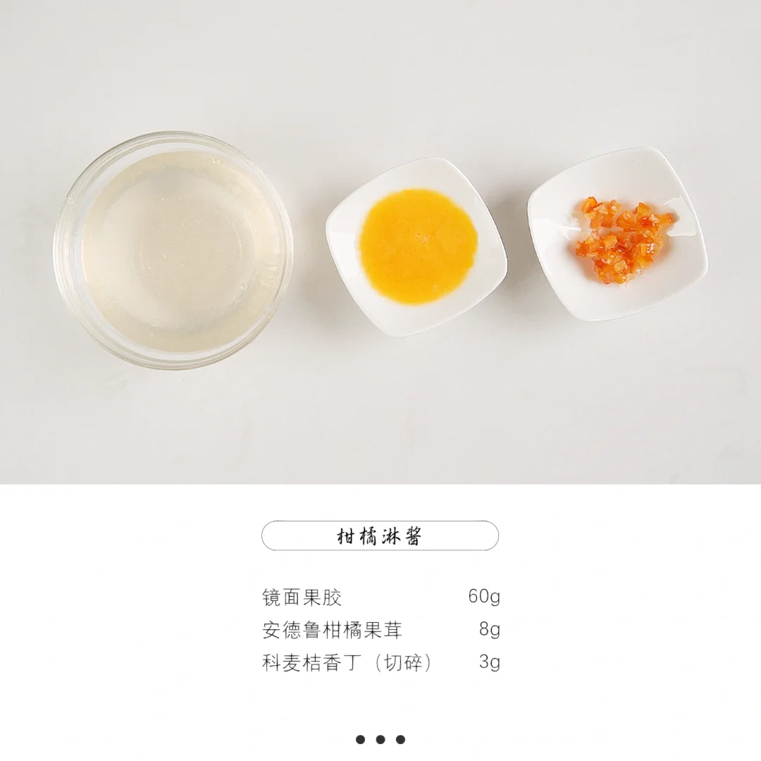 桔香丁切碎,与镜面果胶和柑橘果茸混合搅拌均匀,加热到40°C使用。
