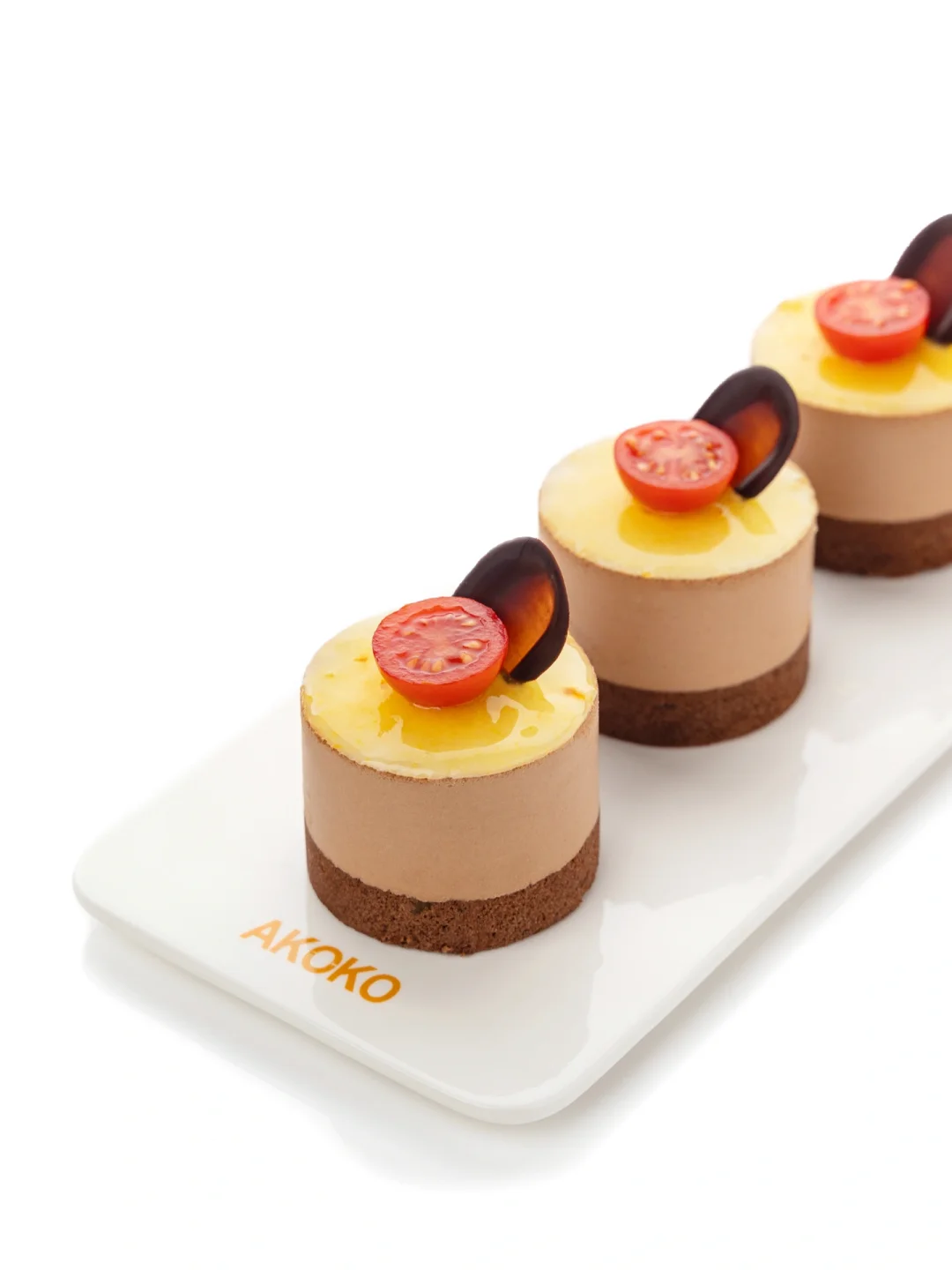 4、慕斯脱模后在顶部裱挤上柑橘淋酱,操作温度为40°C。