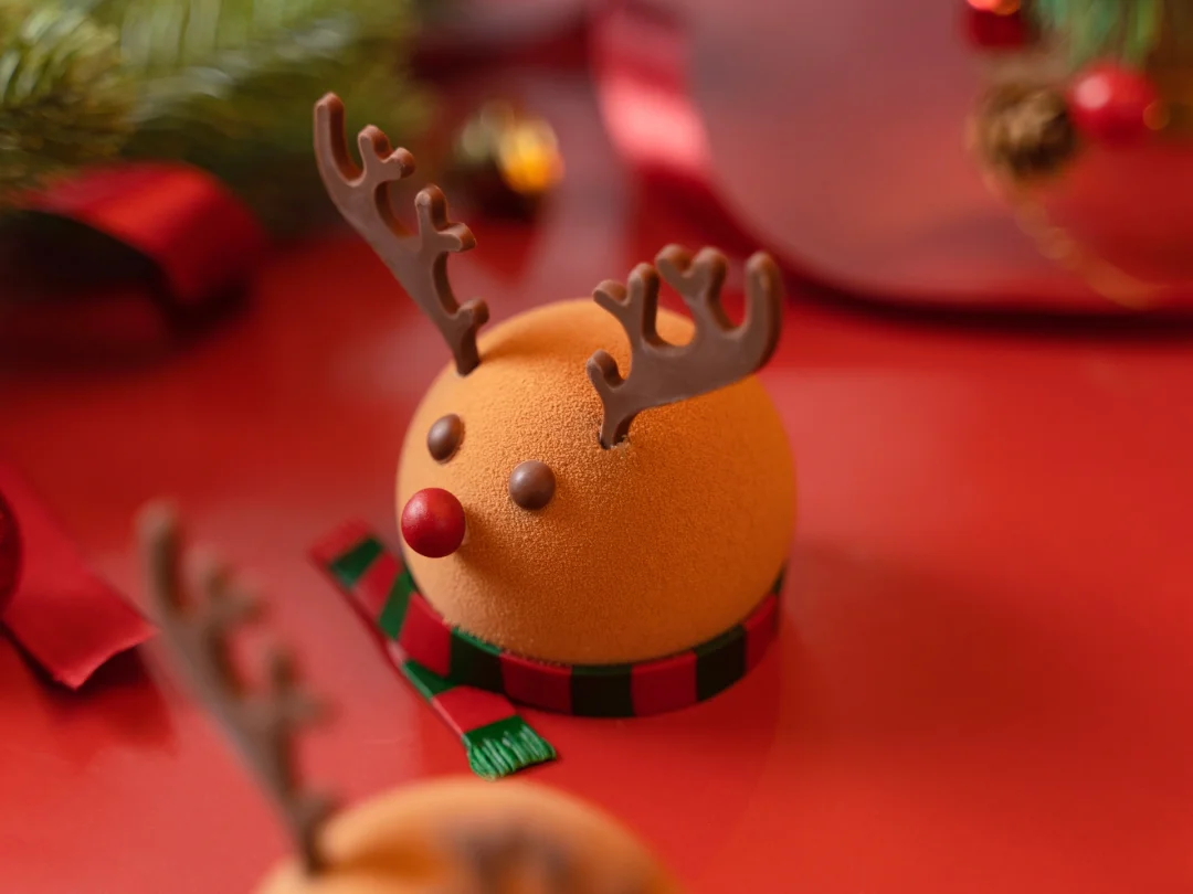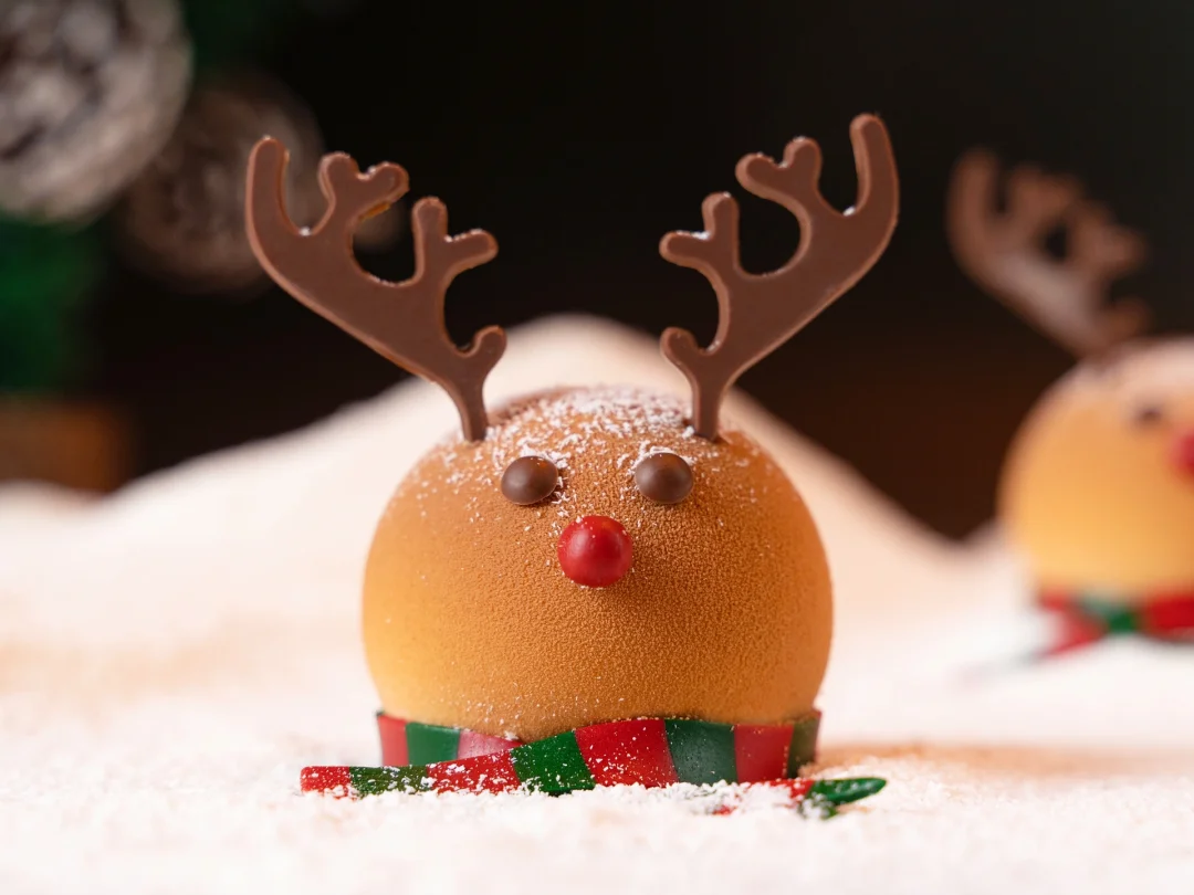 🦌这款驯鹿慕斯从造型上来,选取了经典Q版的驯鹿形象,圆嘟嘟的脸蛋、圆溜溜的眼睛与圆乎乎的鼻子,颇有一种娇憨。从口味上来说,采用适宜秋冬季的焦糖、巧克力和核桃元素,口感层次丰富,顺滑不腻口。