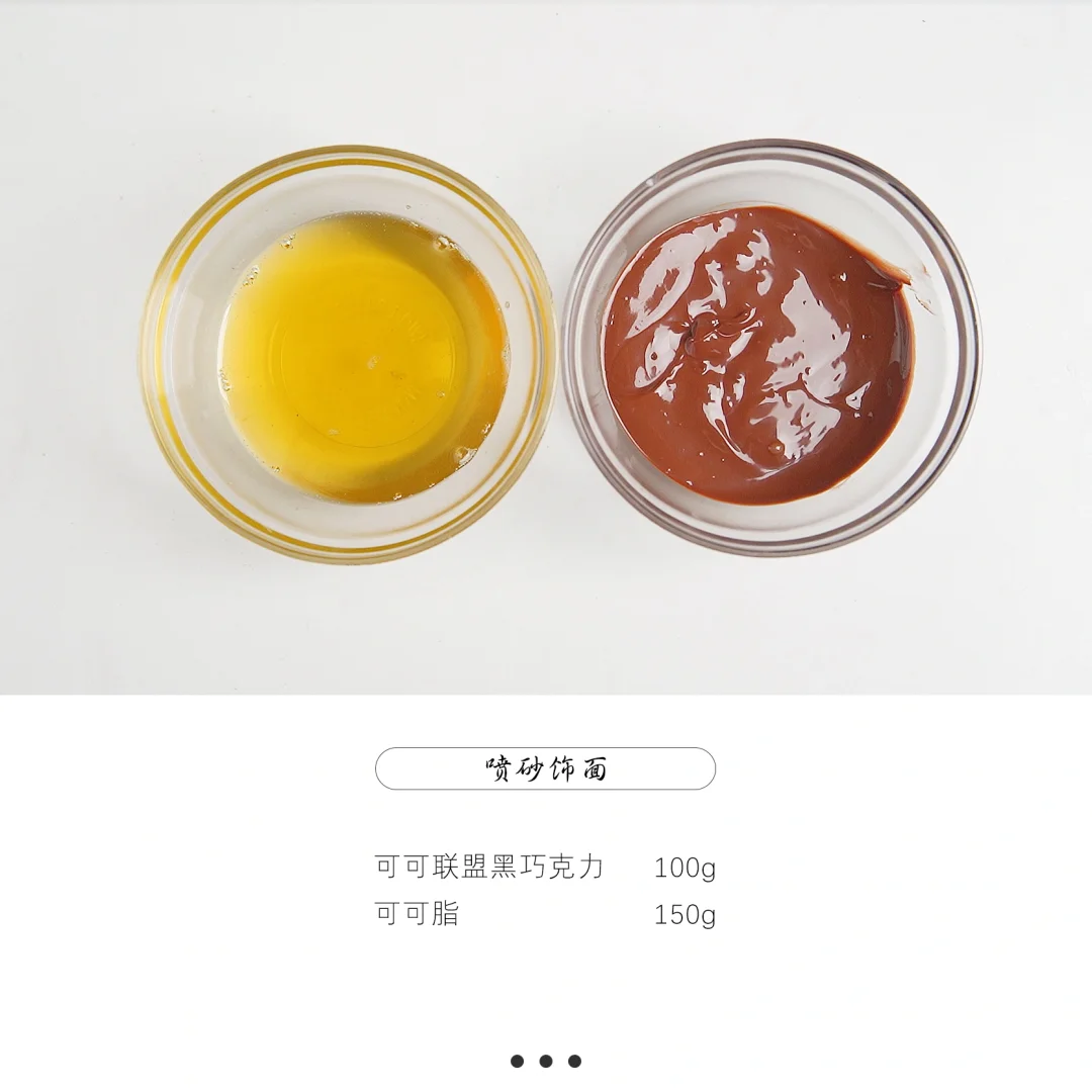 1、喷砂饰面:黑巧克力和可可脂融化后搅拌均匀,35°C使用。