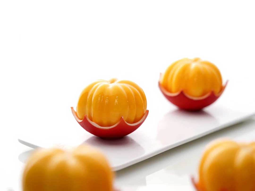 . 🍊秋天少不了的橘子,今天把它制作成慕斯蛋糕,小巧可爱,一口一个[吧唧R] . 🍊配方配比参考: 1⃣️ 杏仁比斯基蛋糕 蛋白168g 砂糖A 200g 杏仁粉 200g 砂糖B 40g 全蛋288g 黄油 36g 玉米淀粉 3g 食盐 2g 低筋粉 64g 1、砂糖A和蛋清打发蛋白霜,打发至鸡尾状。 2、全蛋、砂糖B与杏仁粉拌匀,加入过筛的低筋粉、玉米淀粉和盐,混合搅拌均匀。 3、将蛋白霜与面糊分次混合翻拌均匀。 4、取部分面糊与融化的黄油拌匀,再与剩下的面糊拌匀。 5、平炉上下火160度烤制9分钟左右。 . 2⃣️ 橘子库力 柑橘果茸120g 砂糖 35g NH果胶 4g 吉利丁片 2.5g . 1、预先将NH果胶与砂糖混合拌匀,备用。 2、将果茸加热融化至40℃,然后加入混合好的NH果胶粉与砂糖,快速搅拌,煮至沸腾。 3、煮沸离火后,加入泡好的吉利丁片,融化搅拌均匀即可。 4、注入球形夹心模具(15连),放入冰箱冻硬即可。 . 3⃣️ 卡曼橘慕斯 卡曼橘果茸100g 砂糖 100g 蛋黄50g 马斯卡彭 120g 淡奶油 250g 吉利丁片 10g . 1、卡曼橘果茸、砂糖、蛋黄煮成英式奶酱,83度离火, 2、加入泡好的吉利丁片融化均匀。 3、加入马斯卡彭拌匀后过筛降温,降温至32度分次加入打发至6成的奶油拌匀。 4、注入模具二分之一处,放入夹心再注入慕斯液,放上蛋糕片后冷冻冻硬。 . 4⃣️ 橙色釉面 清水 315g 葡萄糖浆 70g NH果胶 5g 细砂糖A 155g 细砂糖B 35g 右旋糖 135g 酒石酸 1g 橙色水溶液(调色) 适量 . 🍊今天的橘子小甜品就到这里啦 .