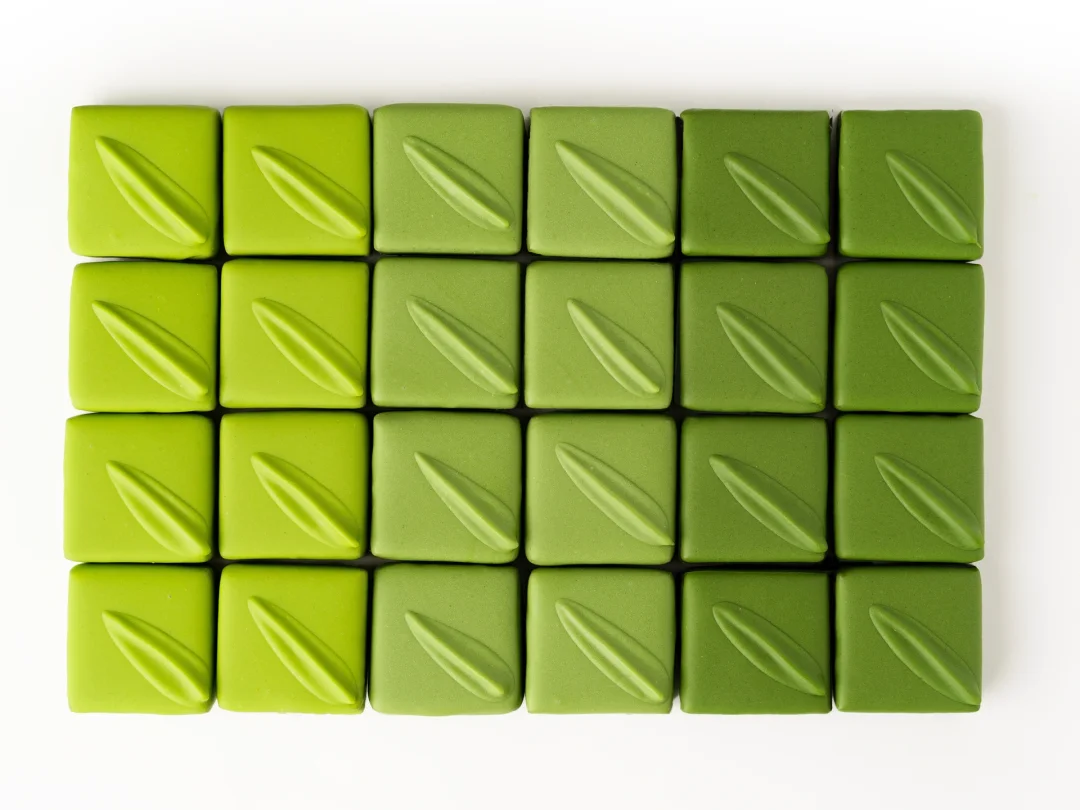 . 🍵 一抹云间青,研得茶中韵。抹茶向来是我所钟爱的,它那清新醇香略带点微苦的味道,似是春雨洗过的草木芳香。今天把这一抹清香茶韵,与白巧克力相融交织,制成抹茶生巧克力,予你同享细腻清甜唇齿流芳。 . 🍵 这款抹茶生巧制作比较简单,在外部增加了涂层的包裹,三色渐变的绿色加上立体青色叶子使整体更具造型感和层次感。从口味上来说口感细腻顺滑,清甜不腻,抹茶特有的清香中融合着白巧克力的甜香,像我这种抹茶控真的是爱了🥹 . 🍵配方配比参考: 1⃣️ 抹茶生巧克力 可可联盟白巧克力 287g 科麦抹茶粉 13g 淡奶油120g SOSA葡萄糖浆 12g 可可脂40g 黄油30g 柠檬汁8g . 1、淡奶油和葡萄糖浆混合微波加热温热(40°C),可可脂和白巧克力融化至35°C。 2、融化的白巧克力、可可脂和抹茶粉搅拌至融合均匀,加入淡奶油和葡萄糖浆后用均质机乳化至顺滑质地。 3、加入软化的黄油和柠檬汁继续均质均匀。 4、制作好的巧克力液倒入生巧亚克力模具中抹平,室温20°C下隔夜静置结晶。 . 🍵外部涂层 1、三色抹茶涂层配比:可可脂用量为白巧克力的10%,抹茶粉分别为巧克力的5%、3%、1%。 2、巧克力和可可脂融化至40°C,分别加入3份抹茶粉,用均质机乳化均匀后进行巧克力的调温操作,涂层浸沾的使用温度为28°C-29°C。 3、表面叶子装饰是由巧克力液制成,具体就是用小刀蘸取适量巧克力液在结晶的涂层表面,一压一提一拉就行啦[萌萌哒R] . 🍵今天的抹茶甜品就到这里啦,抹茶控快来集合啦 .