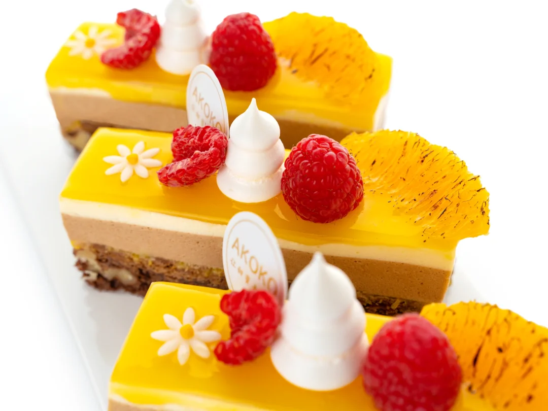 2、顶部镜面果胶液,由适量橘子、芒果果茸与镜面果胶搅匀制成,裱挤到柑橘奶油上。