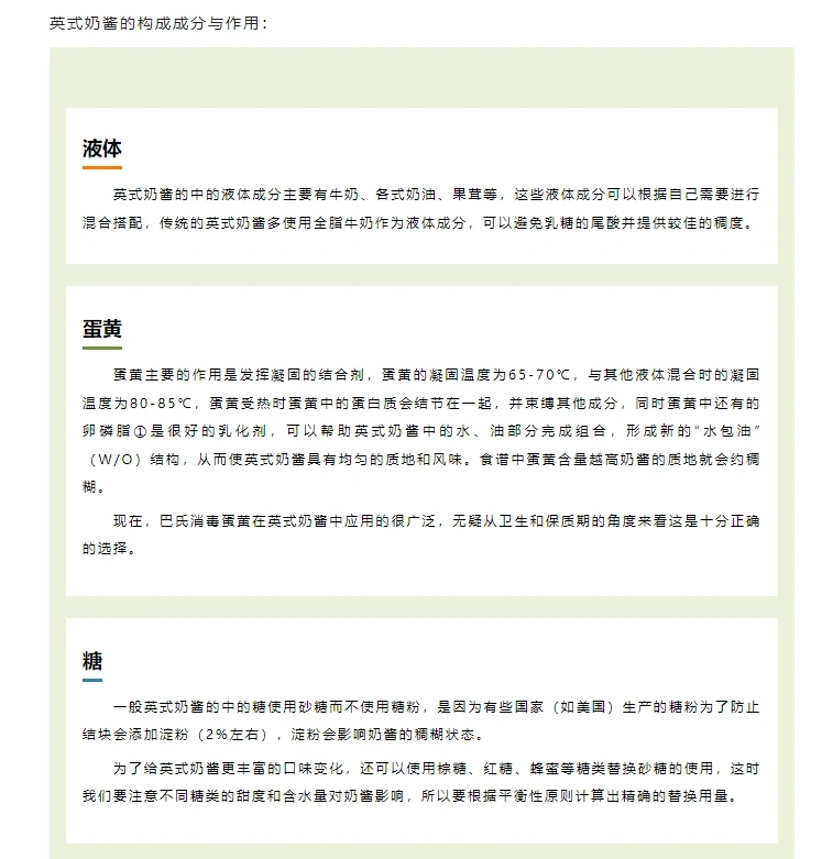 🐄英式奶酱的构成部分以及功能性见后两张图,下篇笔记将分享一部分英式奶酱的各种风味配方与制作。
