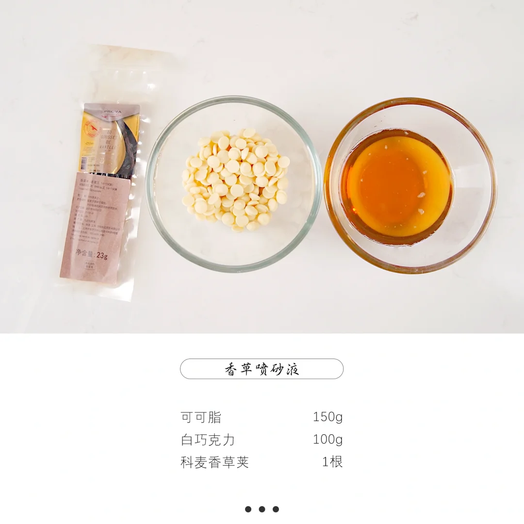 1、喷砂液:白巧克力和可可脂分别融化后倒入量杯,加入香草籽后用均质机乳化均匀,过筛后使用。