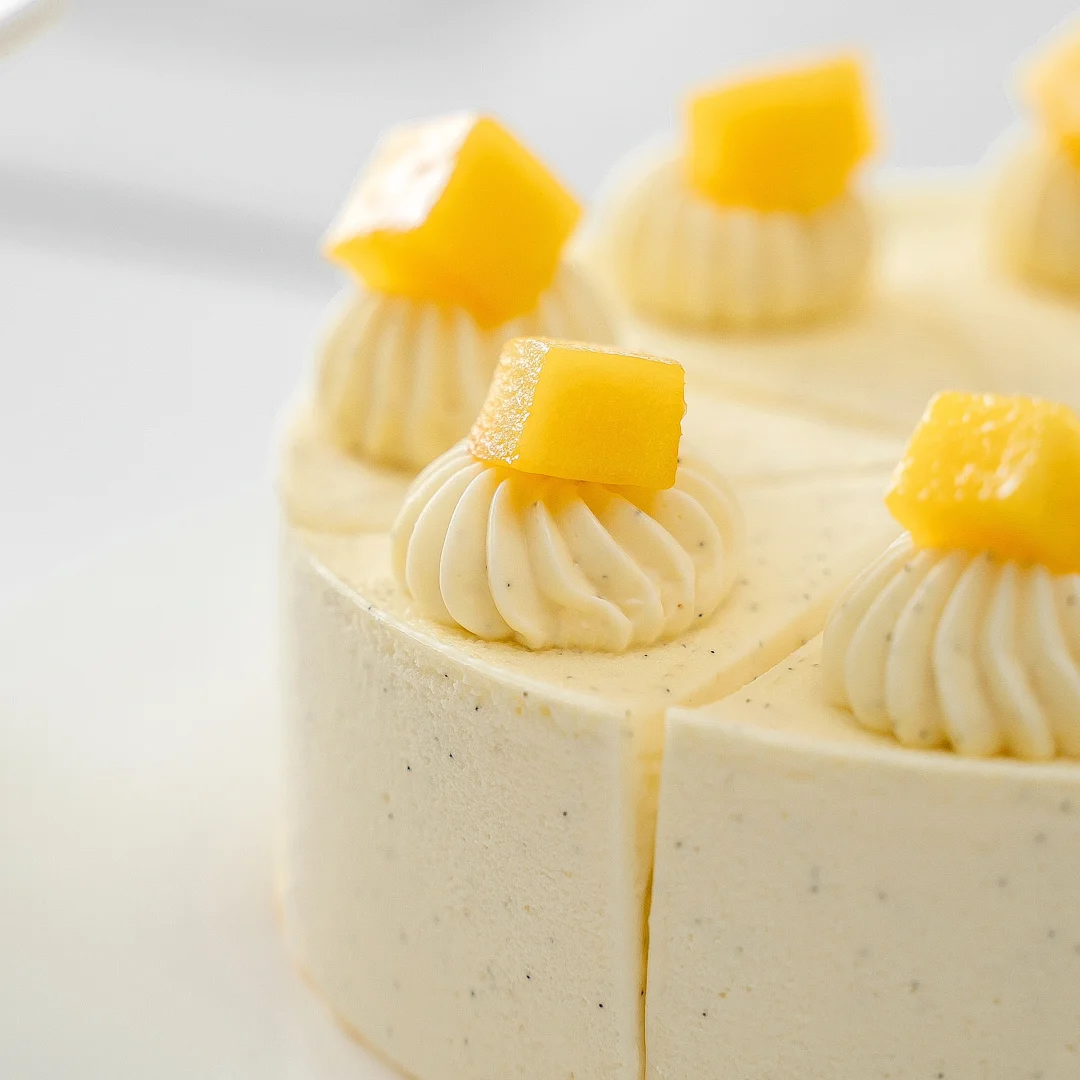 3、室温解冻1小时左右,将蛋糕进行切件操作,表面裱挤上打发的香草奶油,装饰上新鲜切块芒果。