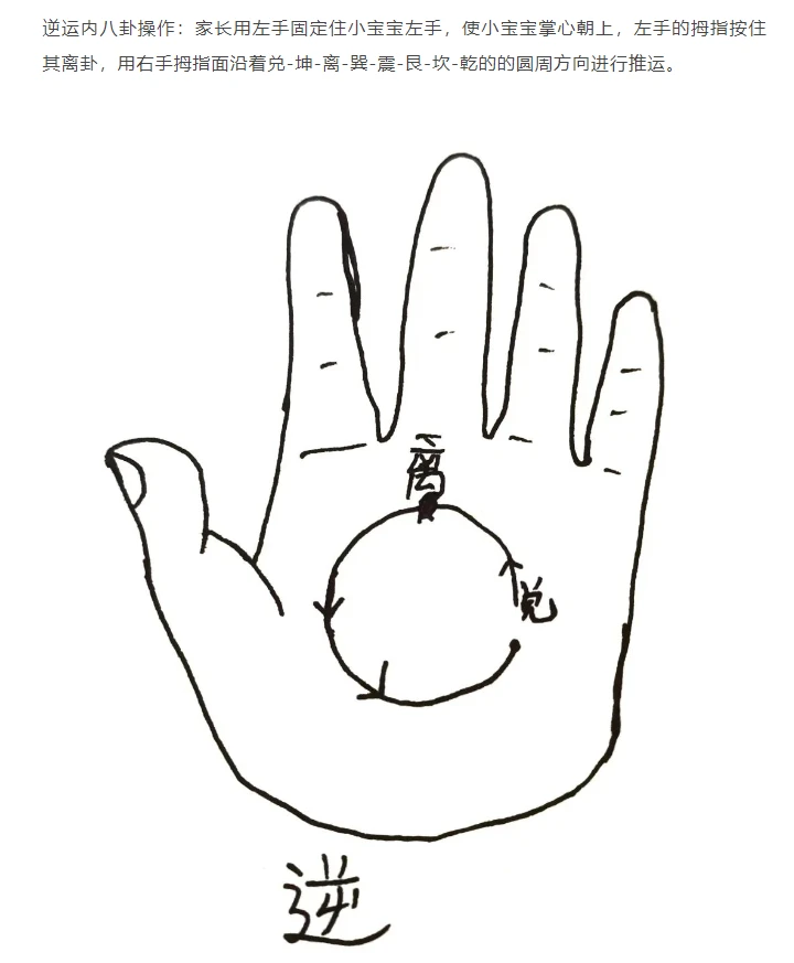 清板门6分钟,清补脾5分钟,逆运内八卦5分钟,清大肠3分钟,清四横纹4分钟,清天河水2分钟。