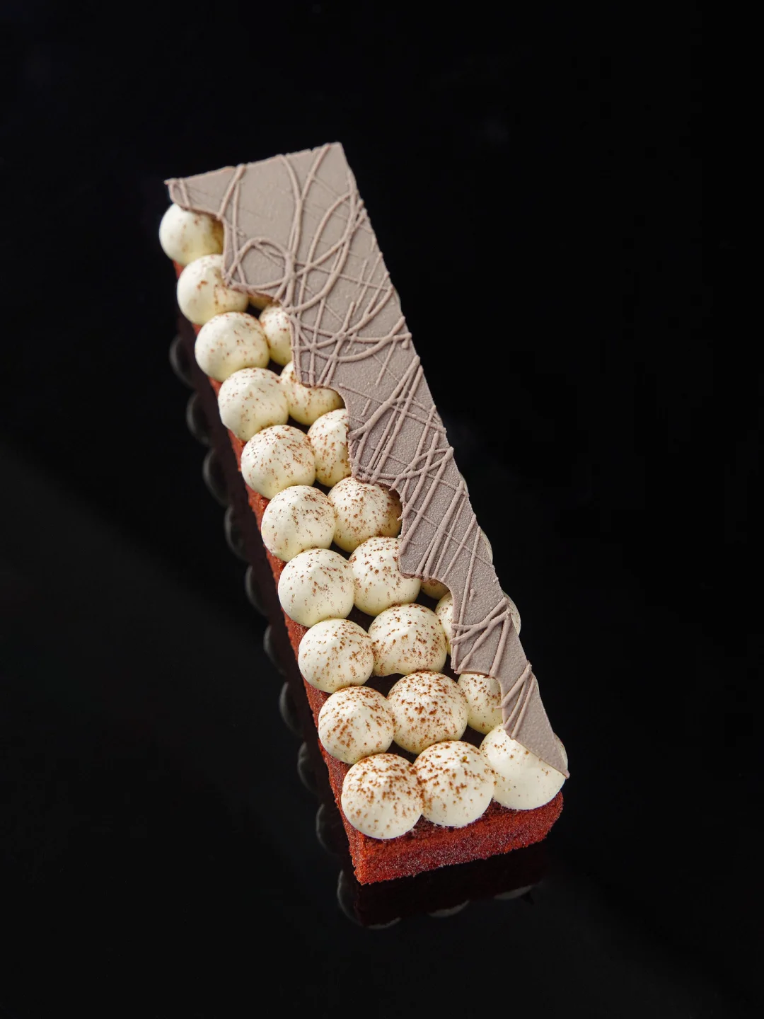 3、香草海盐打发甘纳许打发至可裱挤质地,裱挤到蛋糕上,再筛撒上适量可可粉。