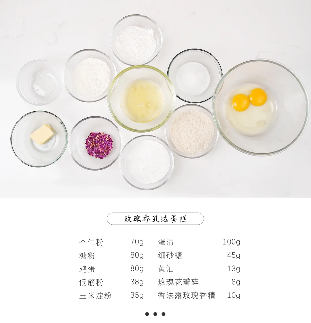 1、鸡蛋、杏仁粉和糖粉混合打至象牙白质地,加入玫瑰香精和玫瑰花瓣碎搅打均匀。