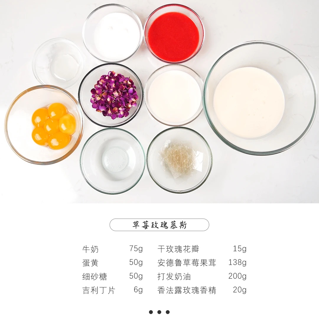 1、牛奶和玫瑰花瓣搅拌加热煮至沸腾后关火,保鲜膜密封静置萃取15分钟,整体均匀过筛后回锅,加入玫瑰香精以中小火加热煮沸。