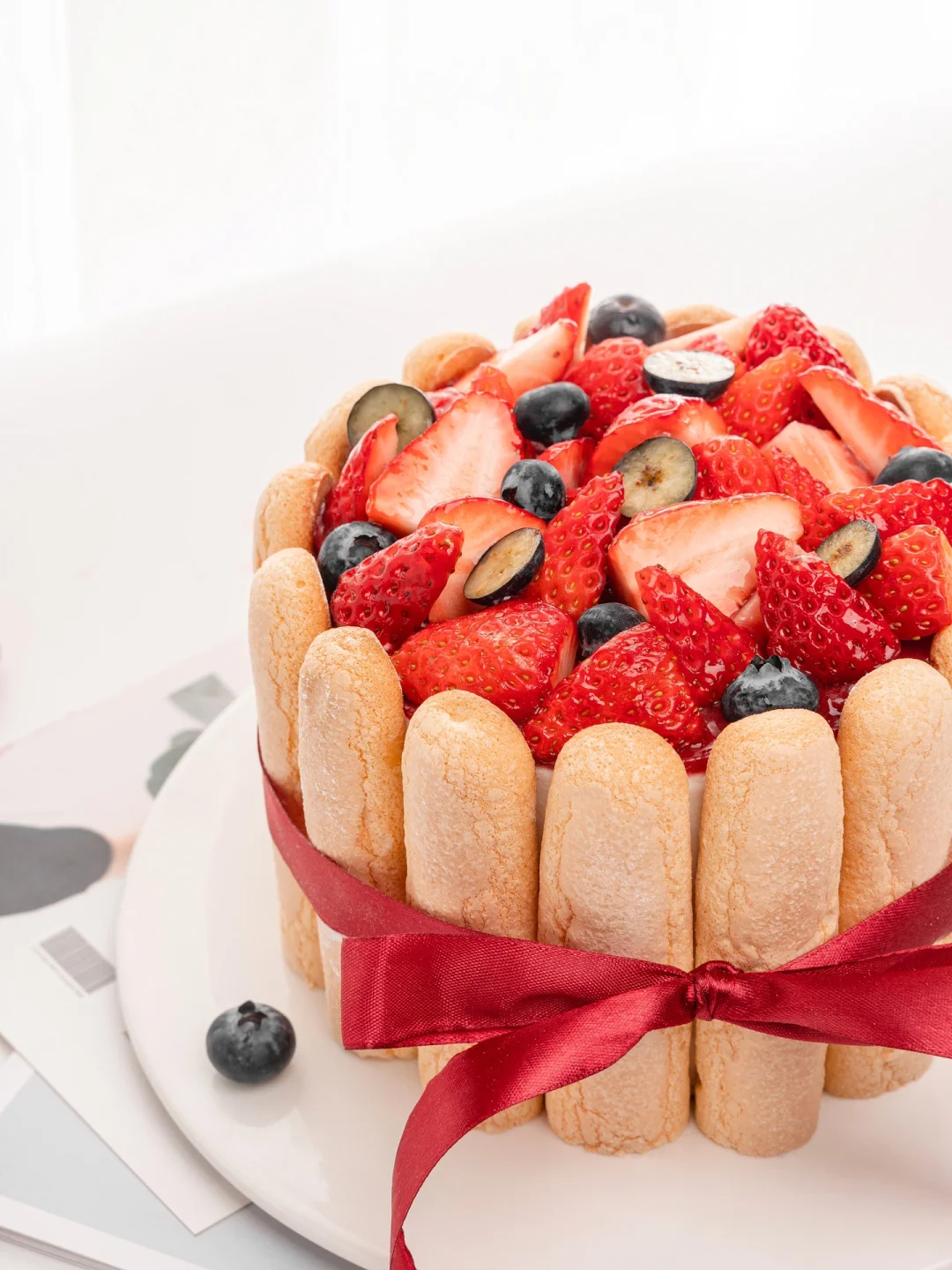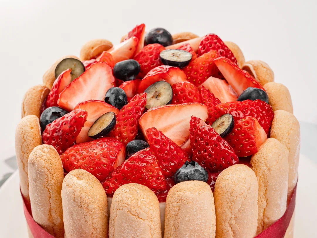 4、表面装饰上新鲜切半草莓和蓝莓,水果上可以刷涂一层镜面果胶液(镜面果胶:清水=9:1)。