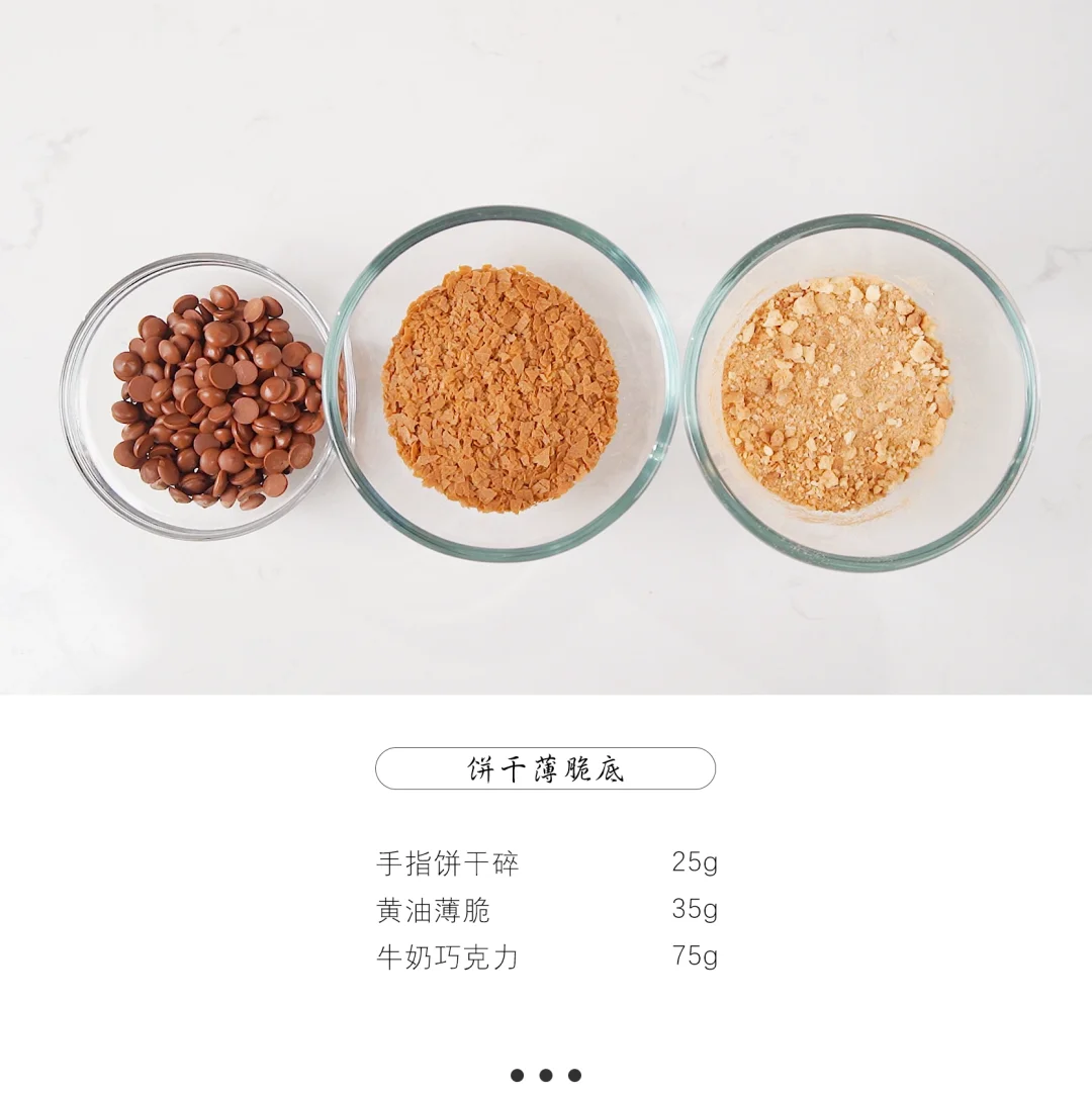 薄脆片和手指饼干碎混合,加入融化的牛奶巧克力搅拌均匀,装入4寸圈模中铺平,用压模压平压实后冷冻定型。