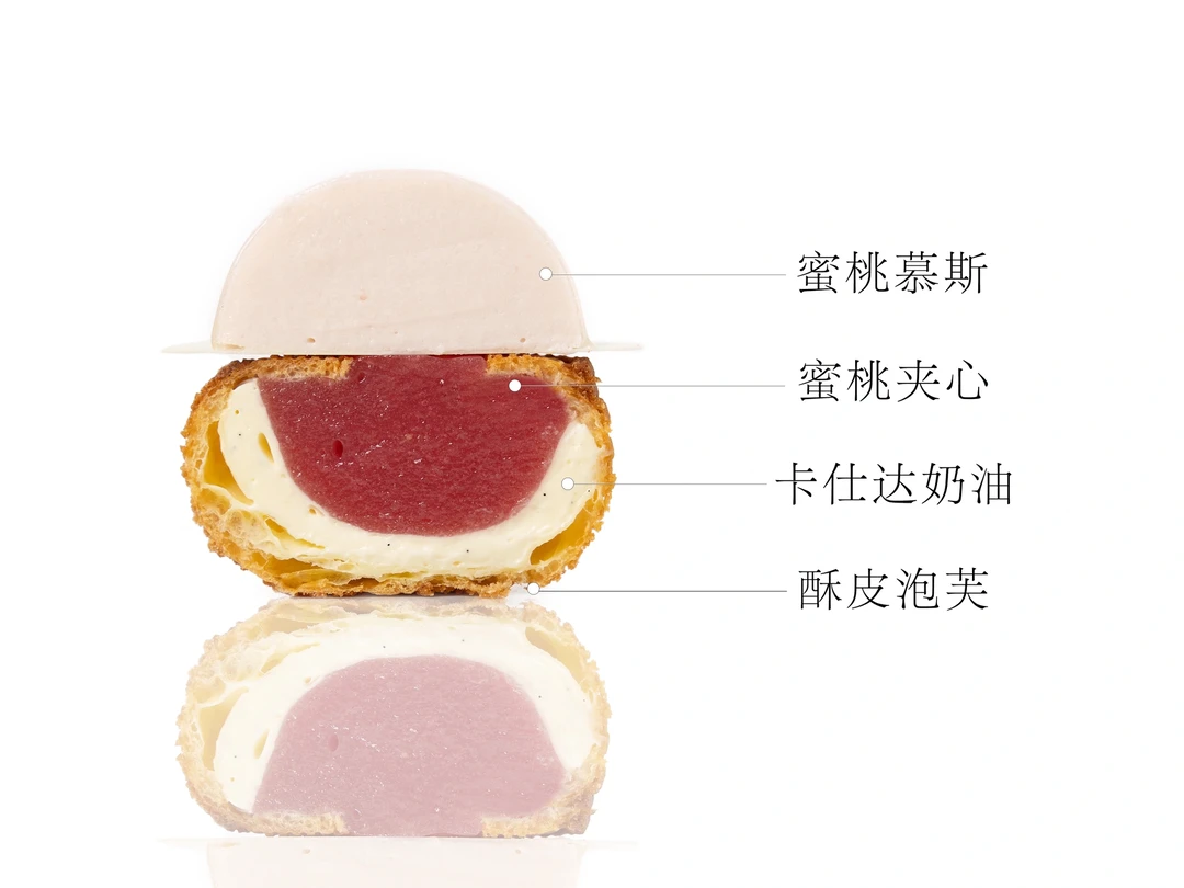 3、泡芙底部挖出小洞,依次注入卡仕达奶油和蜜桃啫喱夹心。
