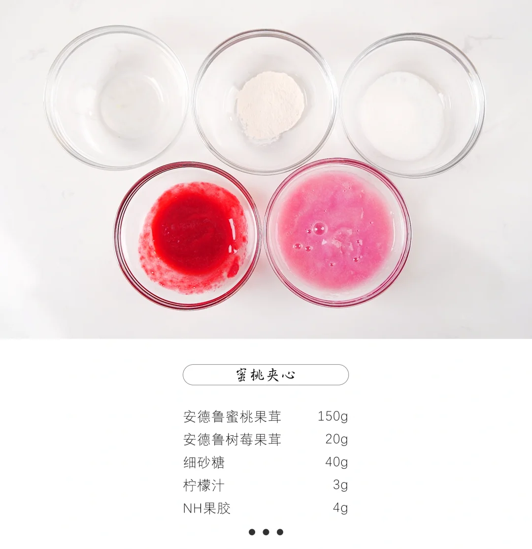 2、蜜桃果茸和树莓果茸混合加热至40°C倒入步骤1的果胶砂糖混合物,继续搅拌煮至沸腾并保持沸腾1分钟收稠离火。