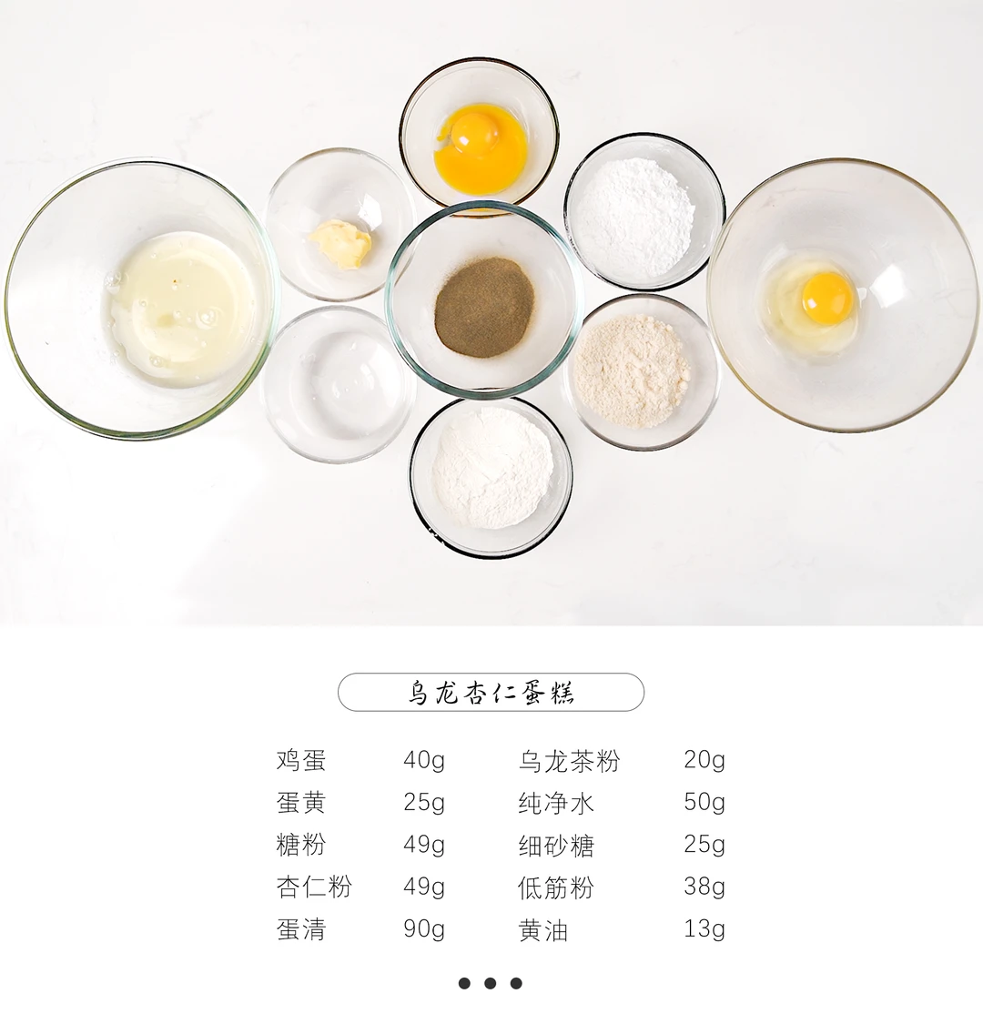 1、鸡蛋、蛋黄、杏仁粉和糖粉混合搅打至呈象牙白色,加入乌龙茶粉(提前与纯净水混合均匀吸满水)搅拌均匀。
