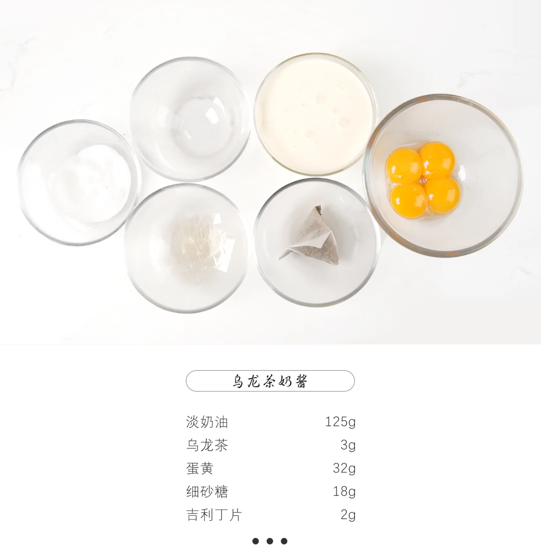 1、淡奶油和乌龙茶包加热煮沸,保鲜膜静置30分钟萃取茶味,再回锅煮至40°C。