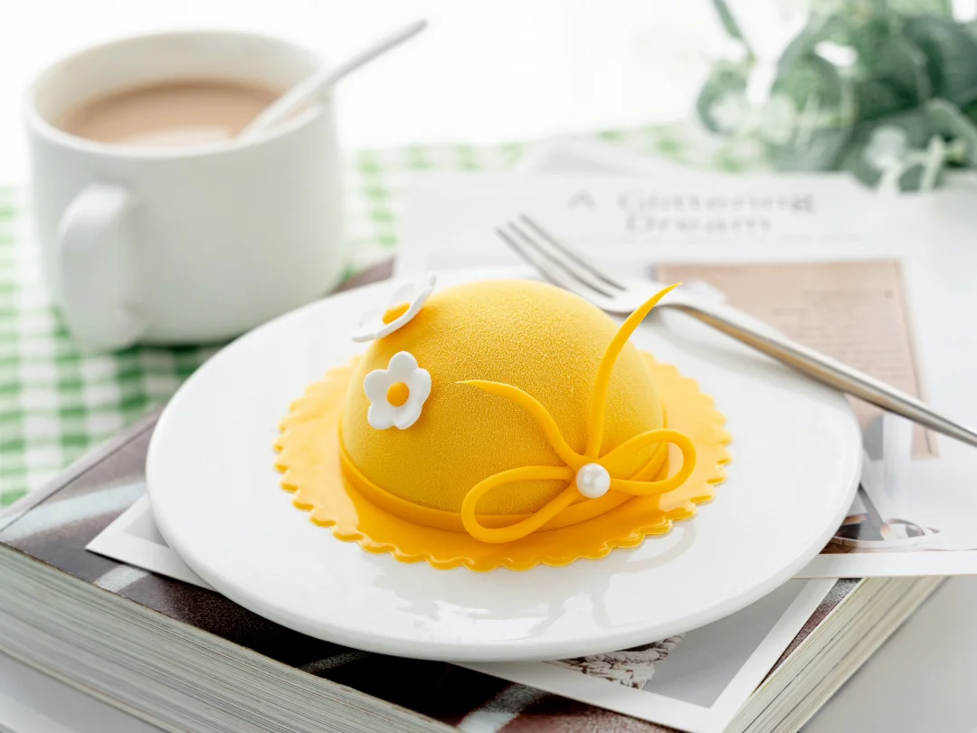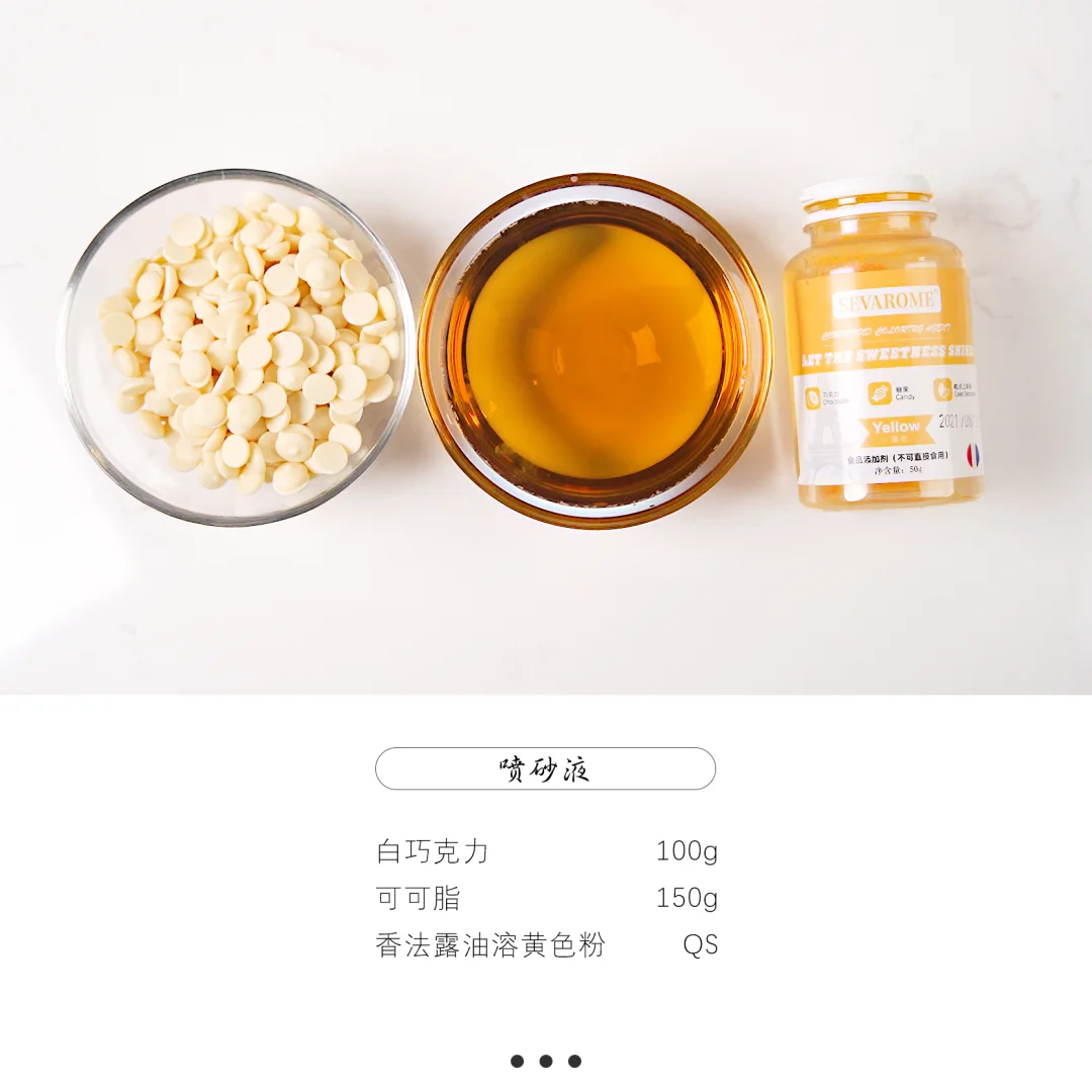 2、喷砂液:白巧克力和可可脂融化打匀,加入适量黄色色粉调色后使用。