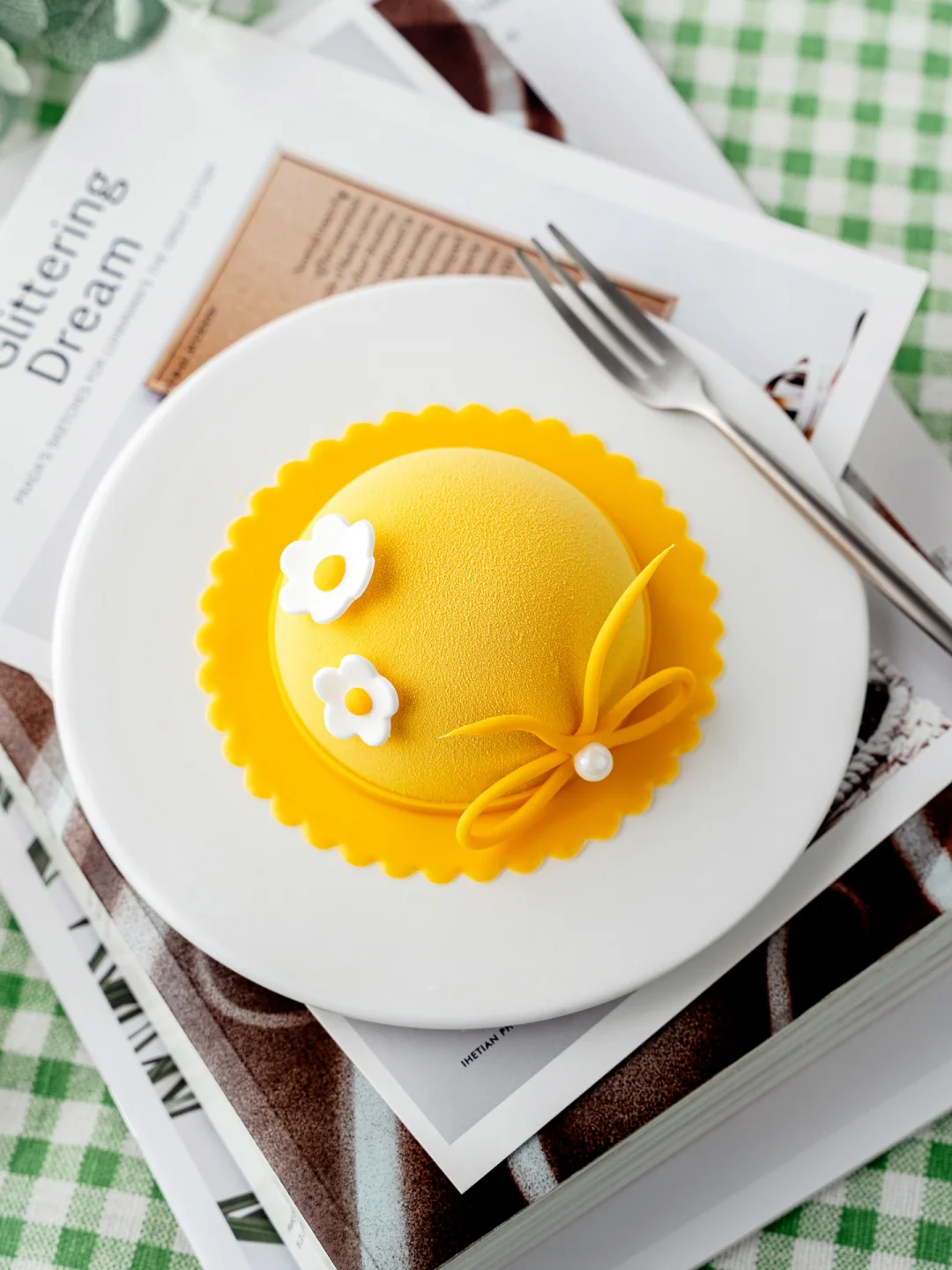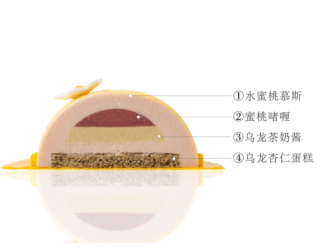 1、将慕斯液注入6连半圆模具,放入脱模的夹心部分,继续注入慕斯液后放入蛋糕片,整理多余慕斯液后冷冻冻硬。