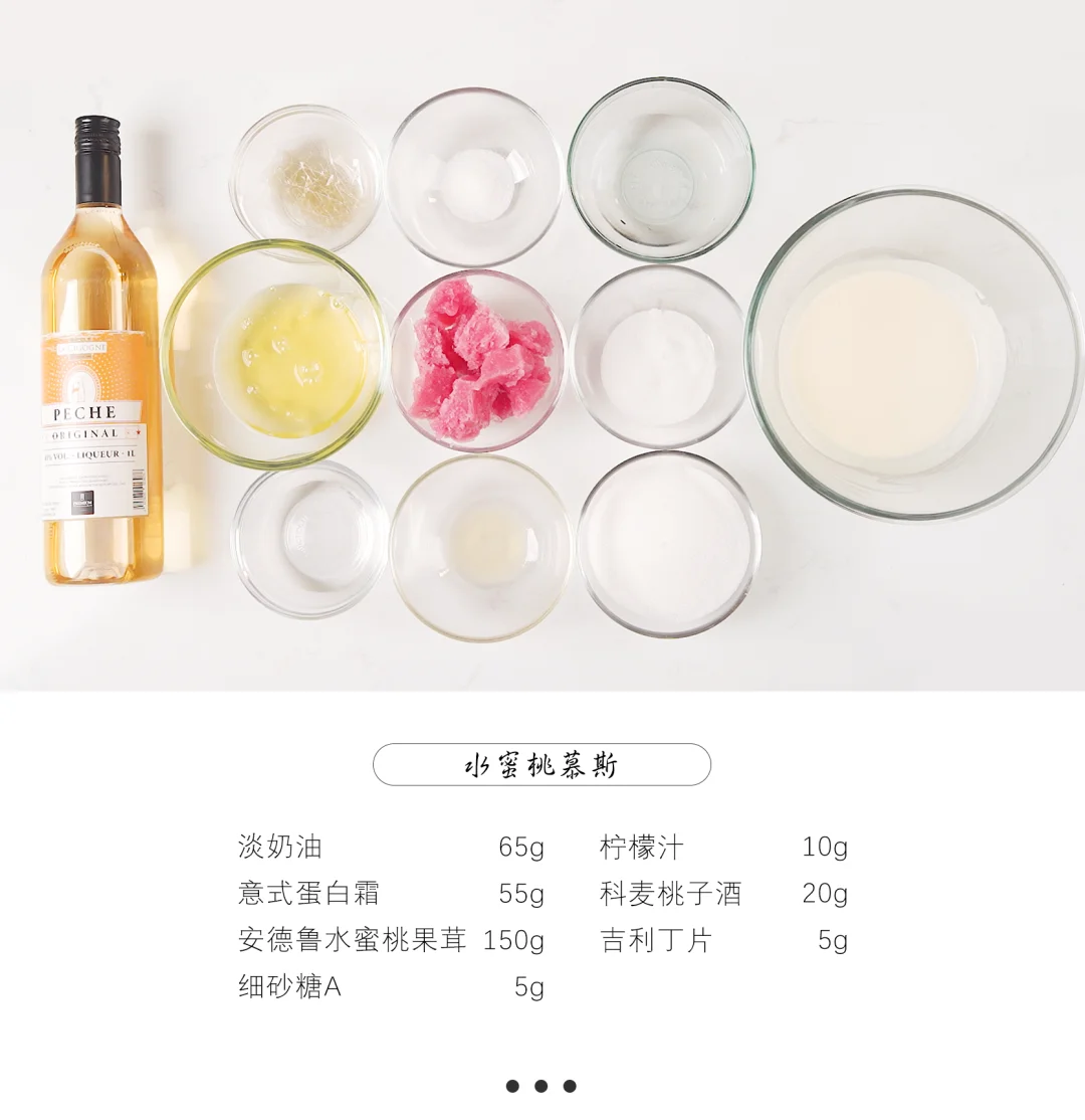 2、蜜桃果茸和柠檬汁倒入锅中加热至40°C,倒入果胶砂糖混合物继续搅拌煮沸并保持沸腾1分钟收稠离火,注入8连半圆模具至4成满后冷冻冻硬。