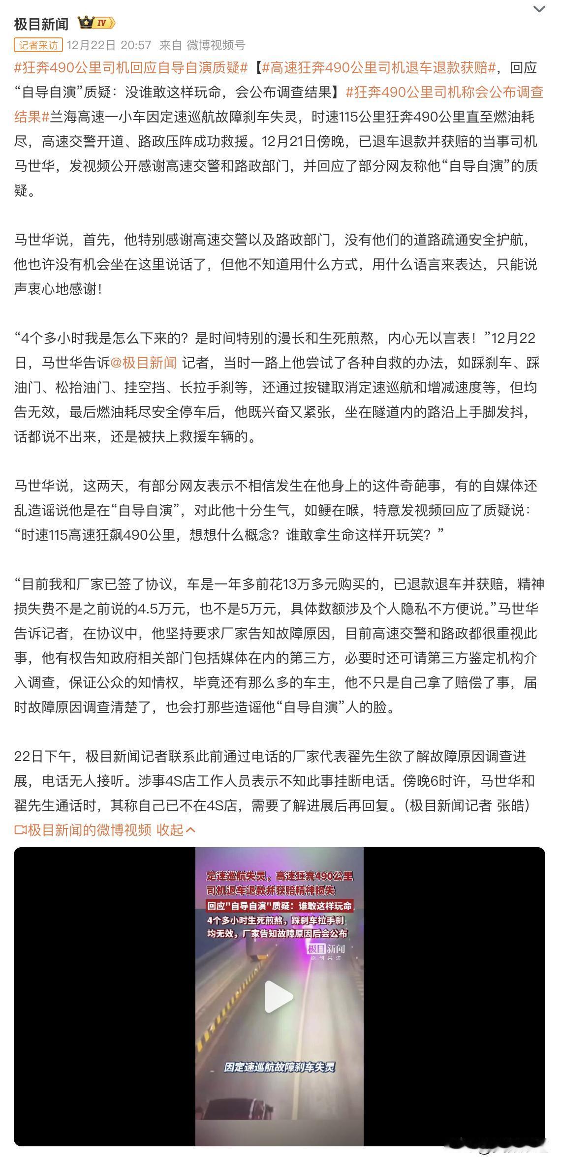 高速狂奔490公里司机退车退款获赔已告一段落,厂家已经退款退车,而小马说要打脸说他“自导自演”的人。用性命攸关的经历挑战了很多工程师的认知,暂时看,他赢了? 狂奔490公里司机回应自导自演质疑狂奔490公里司机称会公布调查结果
